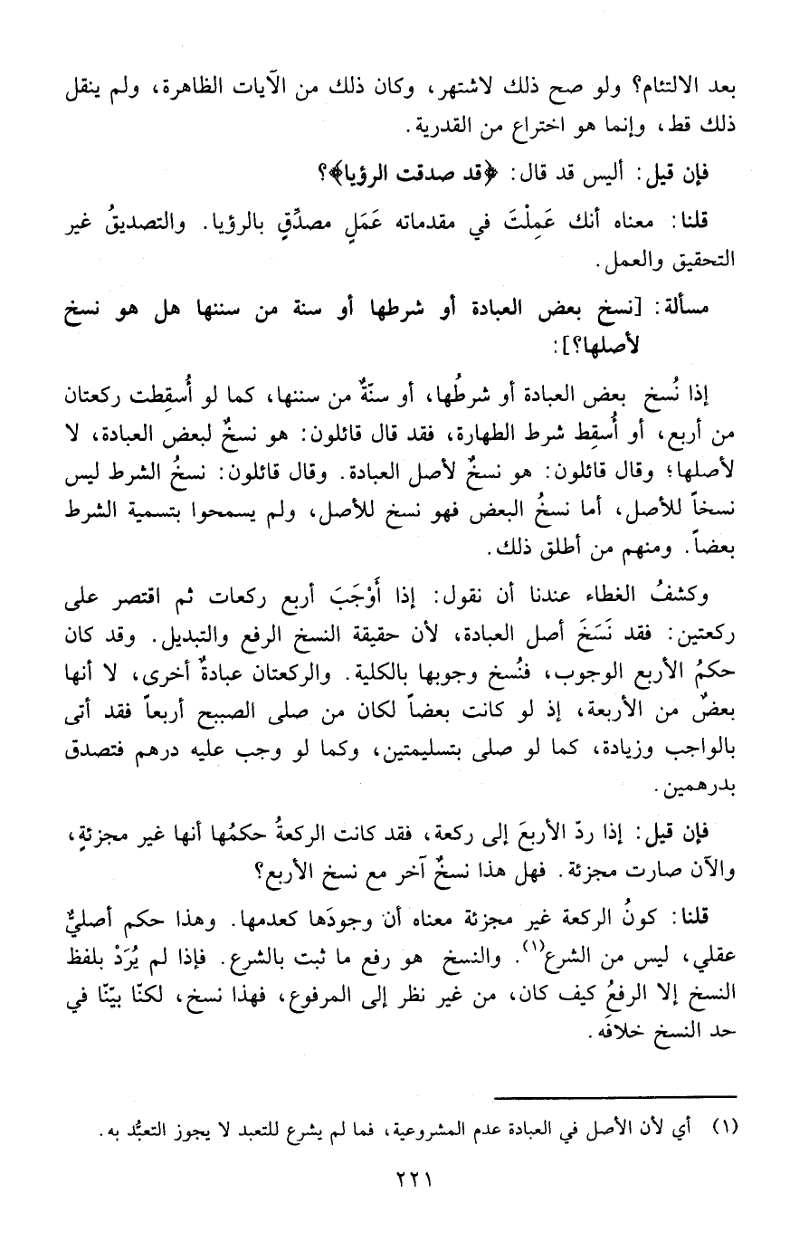 قلنا: كون الركعة غير مجزئة معناه أن وجودها كعدمها وهذا حكم أصلي عقلي ليس من الشرع والنسخ هو رفع ما ثبت بالشرع فإذا لم يرد بلفظ النسخ إلا الرفع كيف كان من غير نظر إلى المرفوع فهذا نسخ لكنا بينا في حد النسخ خلافه