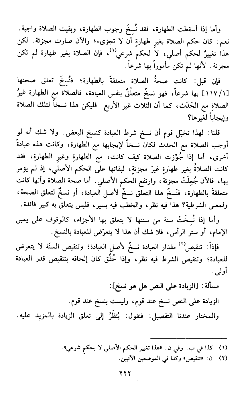 قلنا :لهذا تخيل قوم أن نسخ شرط العبادة كنسخ البعض ولا شك أنه لو أوجب الصلاة مع الحدث لكان نسخا لإيجابها مع الطهارة وكانت هذه عبادة أخرى أما إذا جوزت الصلاة كيف كانت مع الطهارة وغير الطهارة فقد كانت الصلاة بغير طهارة غير مجزئة لبقائها على الحكم الأصلي إذ لم يؤمر بها فالآن جعلت مجزئة وارتفع الحكم الأصلي أما صحة الصلاة وأنها كانت متعلقة بالطهارة فنسخ هذا التعلق نسخ لأصل العبادة أو نسخ لتعلق الصحة ولمعنى الشرطية هذا فيه نظر والخطب فيه يسير فليس يتعلق به كبر فائدة