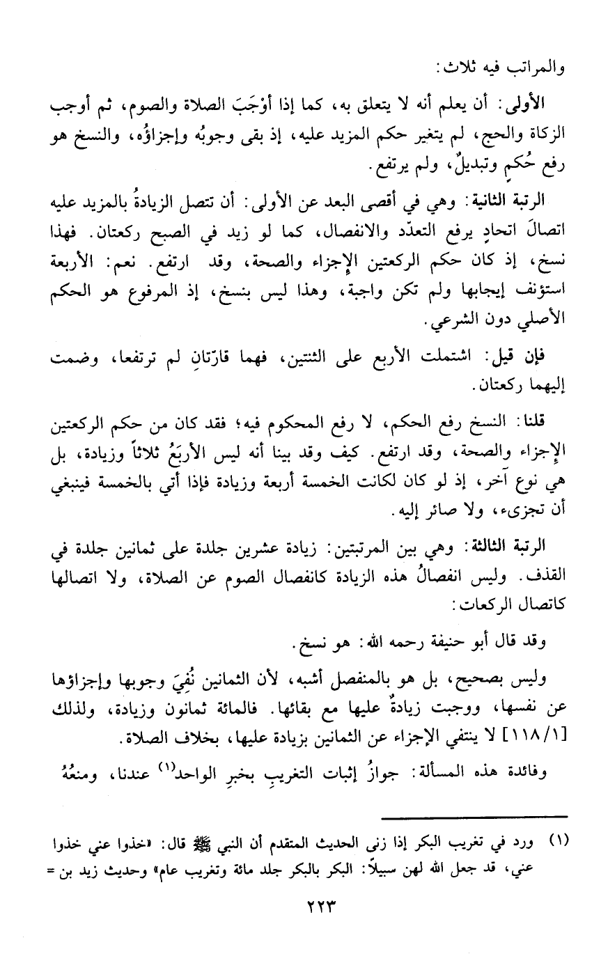 الرتبة الثانية : وهي في أقصى البعد عن الأولى أن تتصل الزيادة بالمزيد عليه اتصال اتحاد يرفع التعدد والانفصال كما لو زيد في الصبح ركعتان فهذا نسخ إذ كان حكم الركعتين الأجزاء والصحة وقد ارتفع نعم الأربعة استؤنف إيجابها ولم تكن واجبة وهذا ليس بنسخ إذ المرفوع هو الحكم الأصلي دون الشرعي