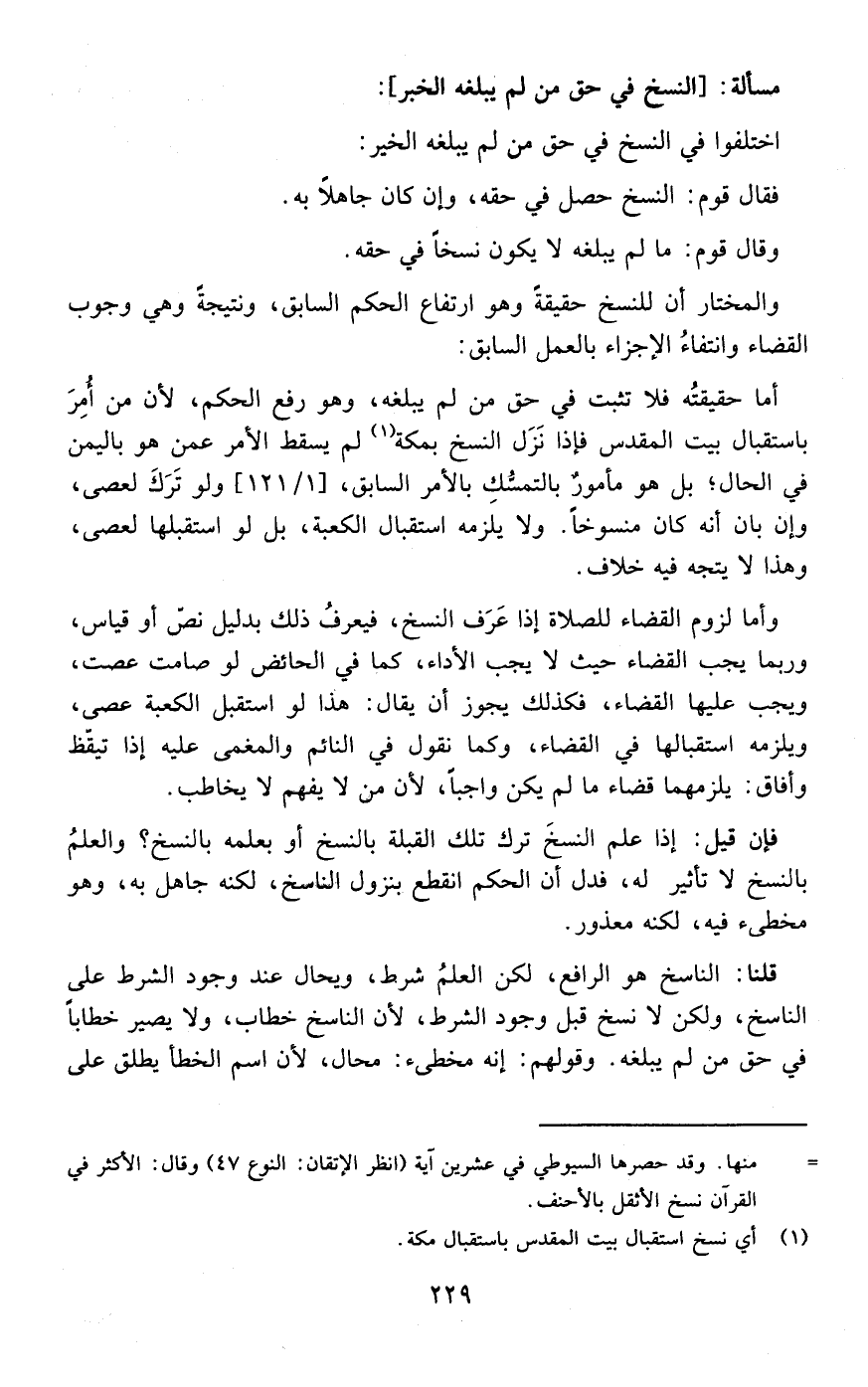قلنا: الناسخ هو الرافع لكن العلم شرط ويحال عند وجود الشرط على الناسخ ولكن لا نسخ قبل وجود الشرط لأن الناسخ خطاب ولا يصير خطابا في حق من لم يبلغه وقولهم أنه مخطىء :محال لأن اسم الخطأ يطلق على