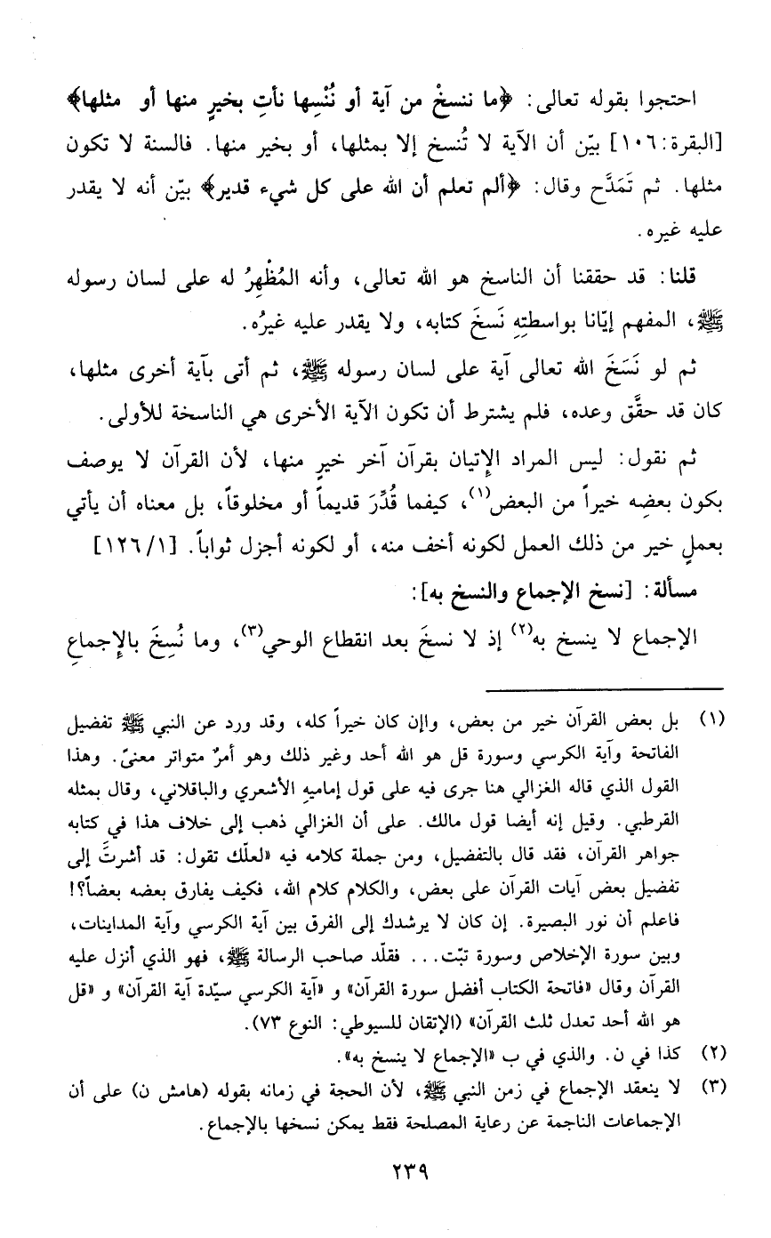 احتجوا بقوله تعالى {مَا نَنْسَخْ مِنْ آيَةٍ أَوْ نُنْسِهَا نَأْتِ بِخَيْرٍ مِنْهَا } ]البقرة: من الآية106[وبين أن الآية لا تنسخ إلا بمثلها أو بخير منها فالسنة لا تكون مثلها ثم تمدح وقال { أَلَمْ تَعْلَمْ أَنَّ اللَّهَ عَلَى كُلِّ شَيْءٍ قَدِيرٌ} ]البقرة: من الآية106[بين أنه لا يقدر عليه غيره