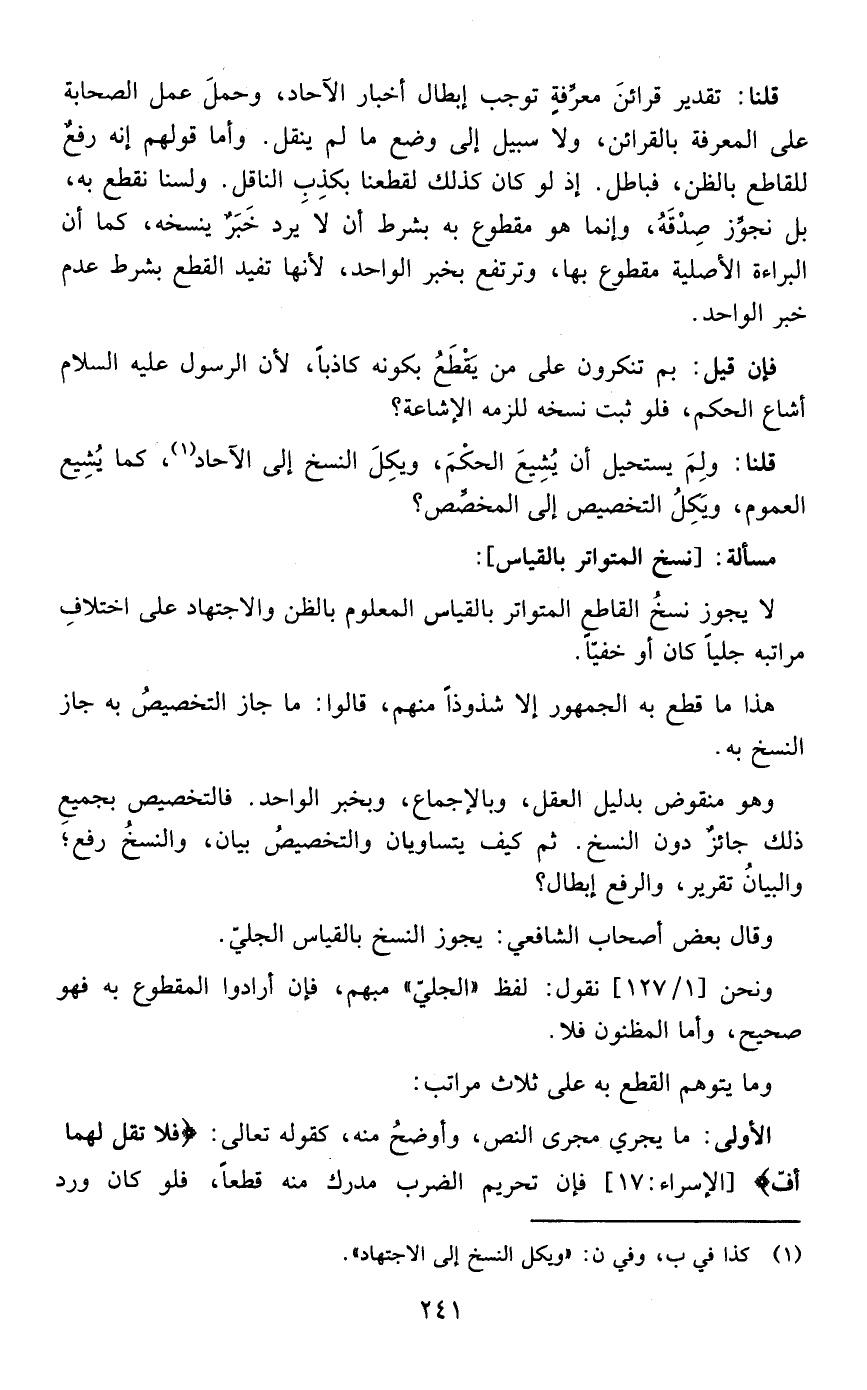 لا يجوز نسخ النص القاطع المتواتر بالقياس المعلوم بالظن والاجتهاد على اختلاف مراتبه جليا كان أو خفيا