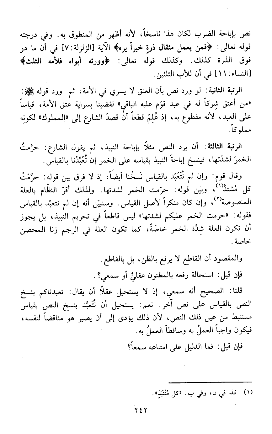 وقال قوم :وإن لم نتعبد بالقياس نسخنا أيضا إذ لا فرق بين قوله حرمت كل منتبذ وبين قوله حرمت الخمر لشدتها ولذلك أقر النظام بالعلة المنصوصة وإن كان منكرا لأصل القياس ولنبين أنه إن لم نتعبد بالقياس فقوله حرمت الخمر عليكم لشدتها ليس قاطعا في تحريم النبيذ بل يجوز أن تكون العلة شدة الخمر خاصة كما تكون العلة في الرجم زنا المحصن خاصة