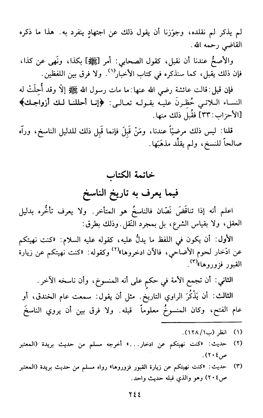 اعلم أنه إذا تناقض نصان فالناسخ هوالمتأخر ولا يعرف تأخره بدليل العقل ولا بقياس الشرع بل بمجرد النقل وذلك بطرق: