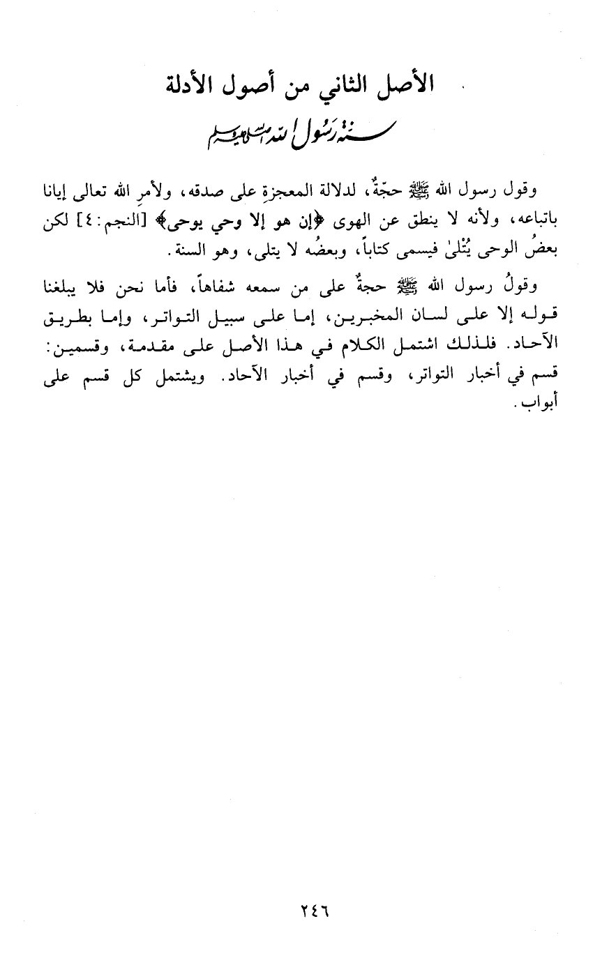 وقول رسول الله صلى الله عليه وسلم حجة لدلالة المعجزة على صدقه ولأمر الله تعالى إيانا باتباعه ولأنه وما ينطق عن الهوى إن هو إلا وحي يوحى النجم لكن بعض الوحي يتلى فيسمى كتابا وبعضه لا يتلى وهو السنة وقول رسول الله صلى الله عليه وسلم حجة على من سمعه شفاعا فأما نحن فلا يبلغنا قوله إلا على لسان المخبرين إما على سبيل التواتر وإما بطريق الآحاد فلذلك اشتمل الكلام في هذا الأصل على مقدمة وقسمين قسم في أخبار التواتر وقسم في أخبار الآحاد ويشتمل كل قسم على أبواب