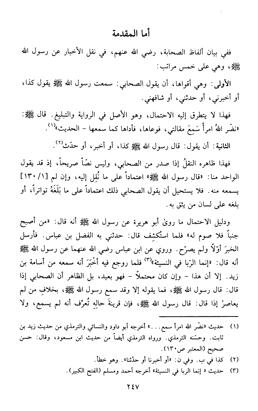 الأولى :وهي أقواها أن يقول الصحابي سمعت رسول الله صلى الله عليه وسلم يقول كذا أو أخبرني أو حدثني أو شافهني فهذا لا يتطرق إليه الاحتمال وهو الأصل في الرواية والتبليغ قال نضر الله امرأ سمع مقالتي فوعاها فأداها كما سمعها الحديث