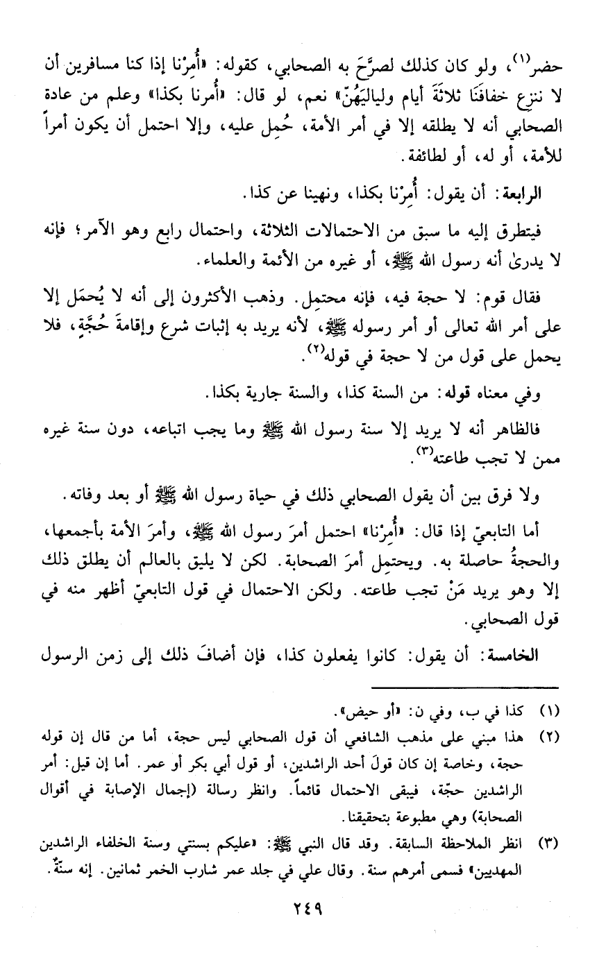 حضر ولو كان كذلك لصرح به الصحابي كقوله أمرنا إذا كنا مسافرين أن لا ننزع خفافنا ثلاثة أيام ولياليهن نعم لو قال أمرنا بكذا وعلم من عادة الصحابي أنه لا يطلقه إلا في أمر الأمة حمل عليه وإلا احتمل أن يكون أمرا للأمة أو له أو لطائفة