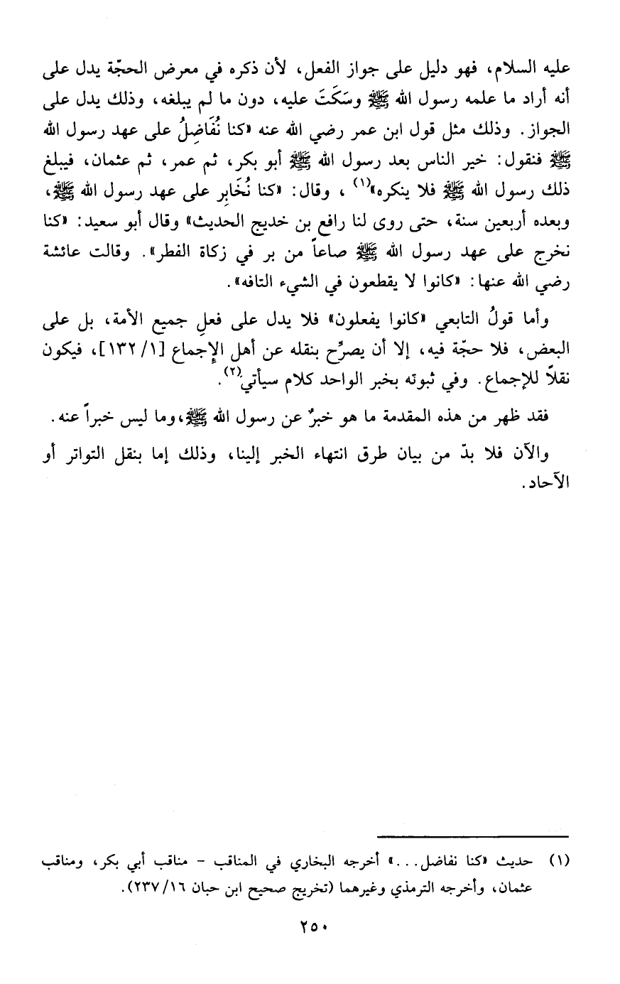 عليه السلام فهو دليل على جواز الفعل لأن ذكره في معرض الحجة يدل على أنه أراد ما علمه رسول الله صلى الله عليه وسلم وسكت عليه دون ما لم يبلغه وذلك يدل على الجواز وذلك مثل قول ابن عمر رضي الله عنه كنا نفاضل على عهد رسول الله صلى الله عليه وسلم فنقول خير الناس بعد رسول الله صلى الله عليه وسلم أبو بكر ثم عمر ثم عثمان فيبلغ ذلك رسول الله فلا ينكره وقال كنا نخابر على عهد رسول الله صلى الله عليه وسلم وبعده أربعين سنة حتى روى لنا رافع بن خديج الحديث وقالأبو سعيد كنا نخرج على عهد رسول الله صاعا من بر في زكاة الفطر وقالت عائشة رضي الله عنها كانوا لا يقطعون في الشيء التافه