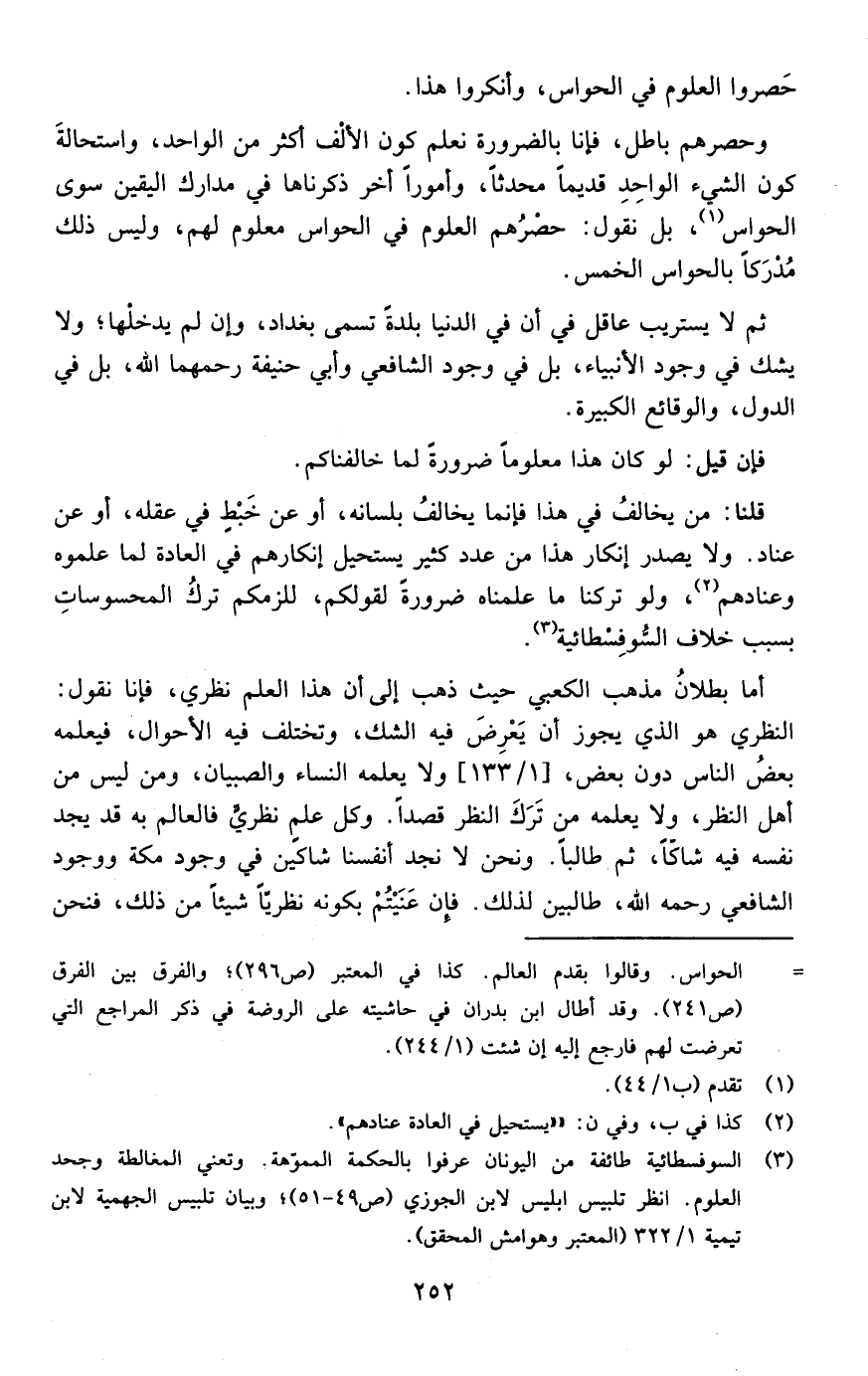وحصرهم باطل فإنا بالضرورة نعلم كون الألف أكثر من الواحد واستحالة كون الشيء الواحد قديما محدثا وأمورا أخر ذكرناها في مدارك اليقين سوى الحواس بل نقول حصرهم العلوم في الحواس معلوم لهم وليس ذلك مدركا بالحواس الخمس