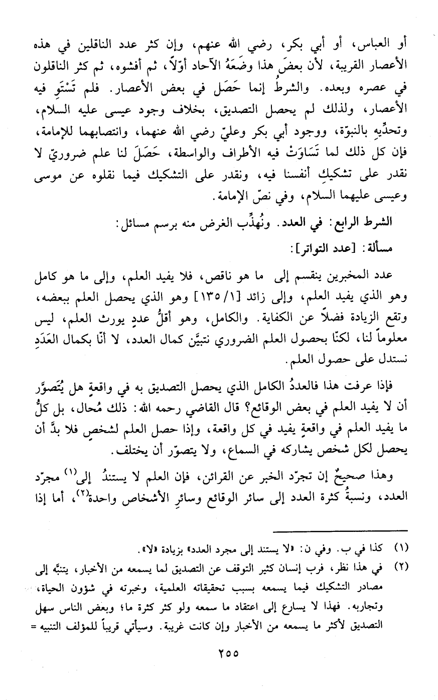 عدد المخبرين ينقسم إلى ما هو ناقص فلا يفيد العلم وإلى ما هو كامل وهو الذي يفيد العلم وإلى زائد وهو الذي يحصل العلم ببعضه وتقع الزيادة فضلا عن الكفاية والكامل وهو أقل عدد يورث العلم ليس معلوما لنا لكنا بحصول العلم الضروري نتبين كمال العدد لا أنا بكمال العدد نستدل على حصول العلم