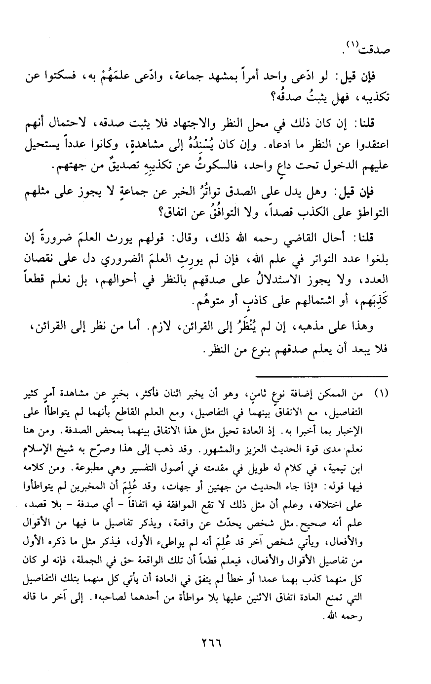 فإن قيل: وهل يدل على الصدق تواتر الخبر عن جماعة لا يجوز على مثلهم التواطؤ على الكذب قصدا ولا التوافق على اتفاق؟