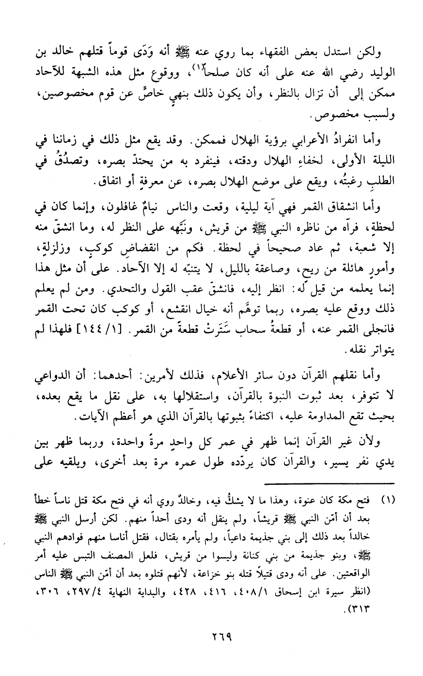 وأما انشقاق القمر فهي آية ليلية وقعت والناس نيام غافلون وإنما كان في لحظة فرآه من ناظره النبي من قريش ونبهه على النظر له وما انشق منه إلا شعبة ثم عاد صحيحا في لحظة فكم من انقضاض كوكب وزلزلة وأمور هائلة من ريح وصاعقة بالليل لا يتنبه له إلا الآحاد على أن مثل هذا إنما يعمله من قيل له انظر إليه فانشق عقيب القول والتحدي ومن لم يعلم ذلك ووقع عليه بصره ربما توهم أنه خيال انقشع أو كوكب كان تحت القمر فانجلى القمر عنه أو قطعة سحاب سترت قطعة من القمر فلهذا لم يتواتر نقله