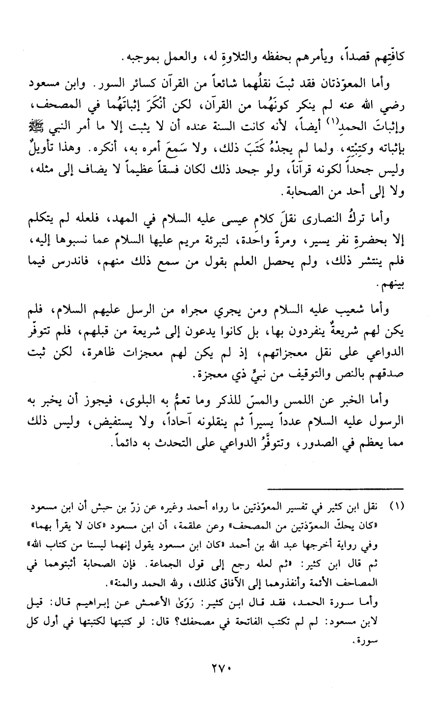 وأما المعوذتان فقد ثبت نقلهما شائعا من القرآن كسائر السور وابن مسعود رضي الله عنه لم ينكر كونهما من القرآن لكن أنكر إثباتهما في المصحف وإثبات الحمد أيضا لأنه كانت السنة عنده أن لا يثبت إلا ما أمر النبي صلى الله عليه وسلم بإثباته وكتبته ولما لم يجده كتب ذلك ولا سمع أمره به أنكره وهذا تأويل وليس جحدا لكونه قرآنا ولو جحد ذلك لكان فسقا عظيما لا يضاف إلى مثله ولا إلى أحد من الصحابة