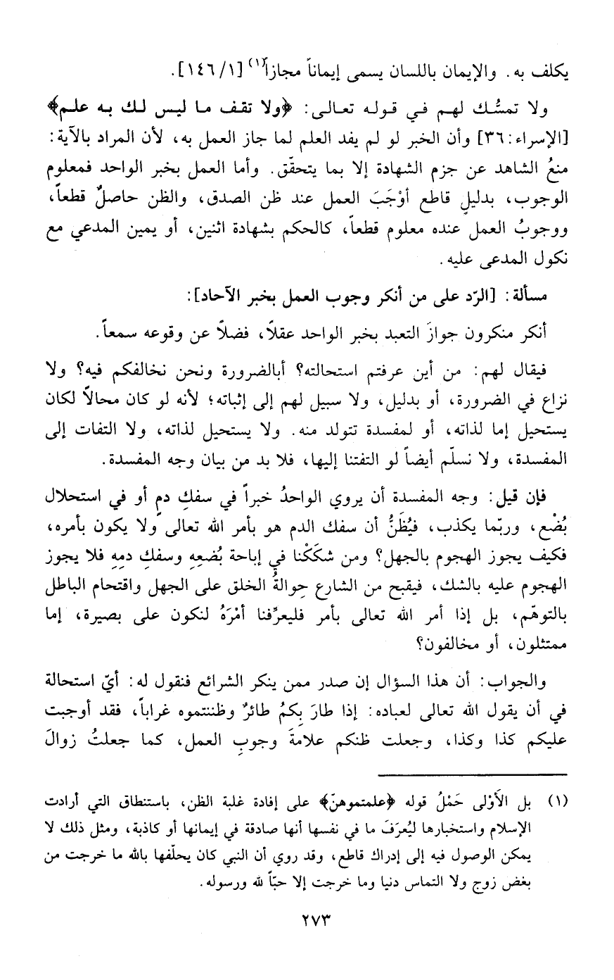ولا تمسك لهم في قوله تعالى {وَلا تَقْفُ مَا لَيْسَ لَكَ بِهِ عِلْمٌ } [الاسراء: من الآية36] وأن الخبر لو لم يفد العلم لما جاز العمل به لأن المراد بالآية منع الشاهد عن جزم الشهادة إلا بما يتحقق وأما العلم بخبر الواحد فمعلوم الوجوب بدليل قاطع أوجب العمل عند ظن الصدق والظن حاصل قطعا ووجوب العمل عنده معلوم قطعا كالحكم بشهادة اثنين أو يمين المدعي مع نكول المدعى عليه