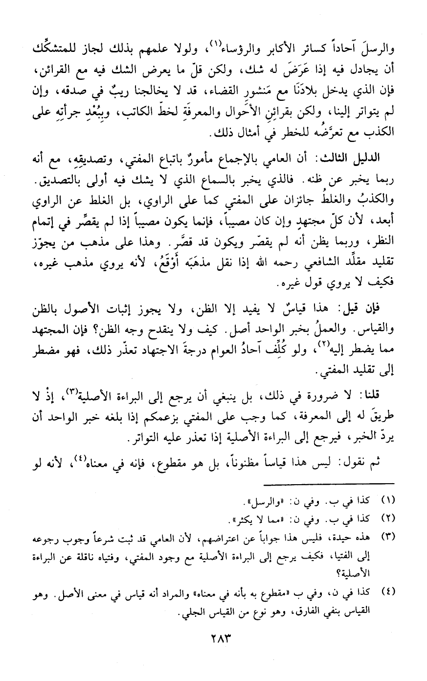 الدليل الثالث: إن العامي بالإجماع مأمور باتباع المفتي وتصديقه مع أنه ربما يخبر عن ظنه فالذي يخبر بالسماع الذي لا يشك فيه أولى بالتصديق والكذب والغلط جائزان على المفتي كما على الراوي بل الغلط على الراوي أبعد لأن كل مجتهد وإن كان مصيبا فإنما يكون مصيبا إذا لم يقصر في إتمام النظر وربما يظن أنه لم يقصر ويكون قد قصر وهذا على مذهب من يجوز تقليد مقلد الشافعي رحمه الله إذا نقل مذهبه أوقع لأنه يروي مذهب غيره فكيف لا يروي قول غيره