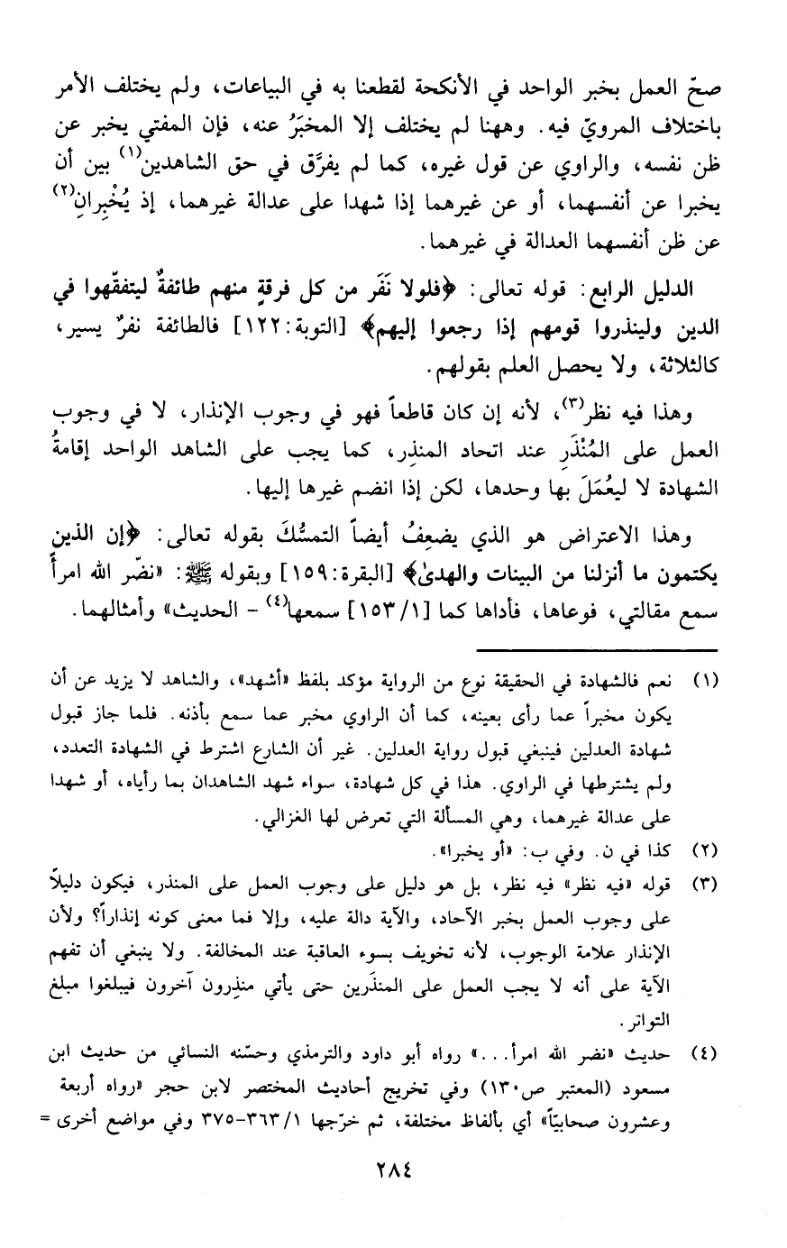 وهذا الاعتراض هو الذي يضعف أيضا التمسك بقوله تعالى :{ إِنَّ الَّذِينَ يَكْتُمُونَ مَا أَنْزَلْنَا مِنَ الْبَيِّنَاتِ وَالْهُدَى} [ البقرة: من الآية159] وبقوله صلى الله عليه وسلم نضر الله امرءا سمع مقالتي فوعاها فأداها كما سمعها الحديث وأمثالهما