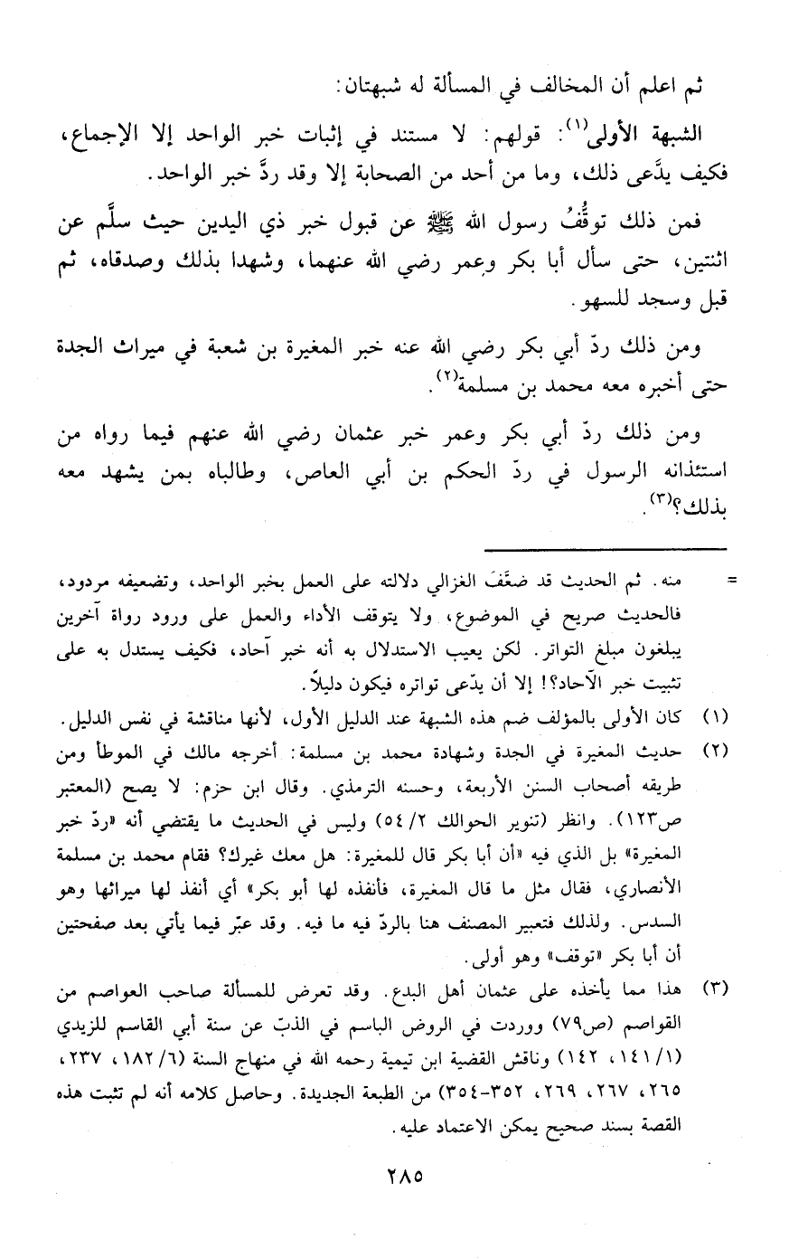 الشبهة الأولى :قولهم لا مستند في إثبات خبر الواحد إلا الإجماع فكيف يدعي ذلك وما من أحد من الصحابة إلا وقد رد خبر الواحد فمن ذلك توقف رسول الله صلى الله عليه وسلم عن قبول خبر ذي اليدين حيث سلم عن اثنتين حتى سأل أبا بكر وعمر رضي الله عنهما وشهدا بذلك وصدقاه ثم قبل وسجد للسهو