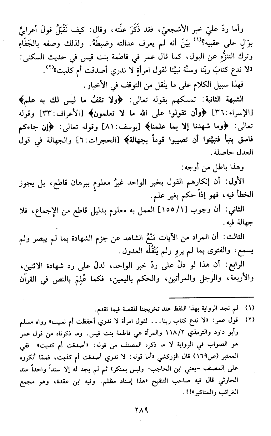 الشبهة الثانية: تمسكهم بقوله تعالى {وَلا تَقْفُ مَا لَيْسَ لَكَ بِهِ عِلْمٌ }] الاسراء: من الآية36[ {وَأَنْ تَقُولُوا عَلَى اللَّهِ مَا لا تَعْلَمُونَ} ] الأعراف من الآية:33[وقوله تعالى {وَمَا شَهِدْنَا إِلاَّ بِمَا عَلِمْنَا } ]يوسف: من الآية81[وقوله تعالى { إِنْ جَاءَكُمْ فَاسِقٌ بِنَبَأٍ فَتَبَيَّنُوا أَنْ تُصِيبُوا قَوْماً بِجَهَالَةٍ } ]الحجرات: من الآية6[والجهالة في قول العدل حاصلة