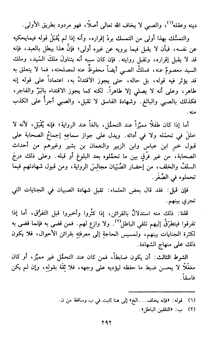 والتمسك بهذا أولى من التمسك برد إقراره وإنه إذا لم يقبل قوله فيما يحكيه عن نفسه فبأن لا يقبل فيما يرويه عن غيره أولى فإن هذا يبطل بالعبد فإنه قد لا يقبل إقراره وتقبل روايته فإن كان سببه أنه يتناول ملك السيد وملك السيد معصوم عنه فملك الصبي أيضا محفوظ عنه لمصلحته فما لا يتعلق به قد يؤثر فيه قوله بل حاله حتى يجوز الاقتداء به اعتمادا على قوله أنه ظاهر وعلى أنه لا يصلي إلا طاهر لكنه كما يجوز الاقتداء بالبر والفاجر فكذلك بالصبي والبالغ وشهادة الفاسق لا تقبل والصبي أجرأ على الكذب منه