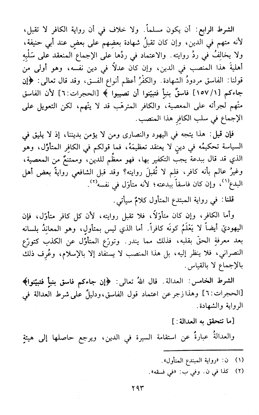 الشرط الخامس : العدالة قال الله تعالى {إِنْ جَاءَكُمْ فَاسِقٌ بِنَبَأٍ فَتَبَيَّنُوا أَنْ تُصِيبُوا} ]الحجرات: من الآية6[ وهذا زجر عن اعتماد قول الفاسق ودليل على شرط العدالة في الرواية والشهادة