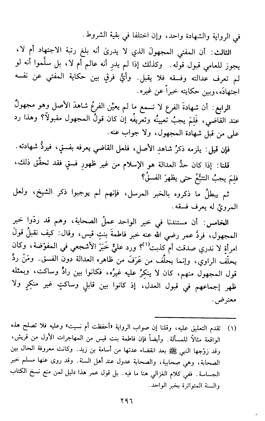 الخامس : أن مستندنا في خبر الواحد عمل الصحابة وهم قد ردوا خبر المجهول فرد عمر رضي الله عنه فاطمة بنت قيس وقال كيف نقبل قول امرأة لا ندري صدقت أم كذبت ؟ ورد علي خبر الأشجعي في المفوضة وكان يحلف الراوي وإنما يحلف من عرف من ظاهره العدالة دون الفسق ومن رد قول المجهول منهم كان لا ينكر عليه غيره فكانوا بين راد وساكت وبمثله ظهر إجماعهم في قبول العدل إذ كانوا بين قابل وساكت غير منكر ولا معترض