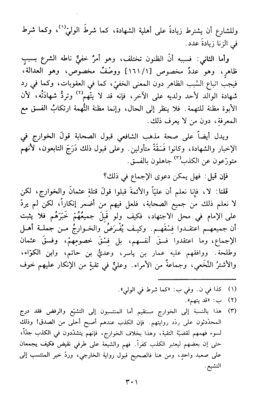 وأما الثاني: فسببه أن الظنون تختلف وهو أمر خفي ناطه الشرع بسبب ظاهر وهو عدد مخصوص ووصف مخصوص وهو العدالة فيجب اتباع السبب الظاهر دون المعنى الخفي كما في العقوبات وكما في رد شهادة الوالد لأحد ولديه على الآخر فإنه قد يتهم وترد شهادته لأن الأبوة مظنة للتهمة فلا ينظر إلى الحال وإنما مظنة التهمة ارتكاب الفسق مع المعرفة دون من لا يعرف ذلك
