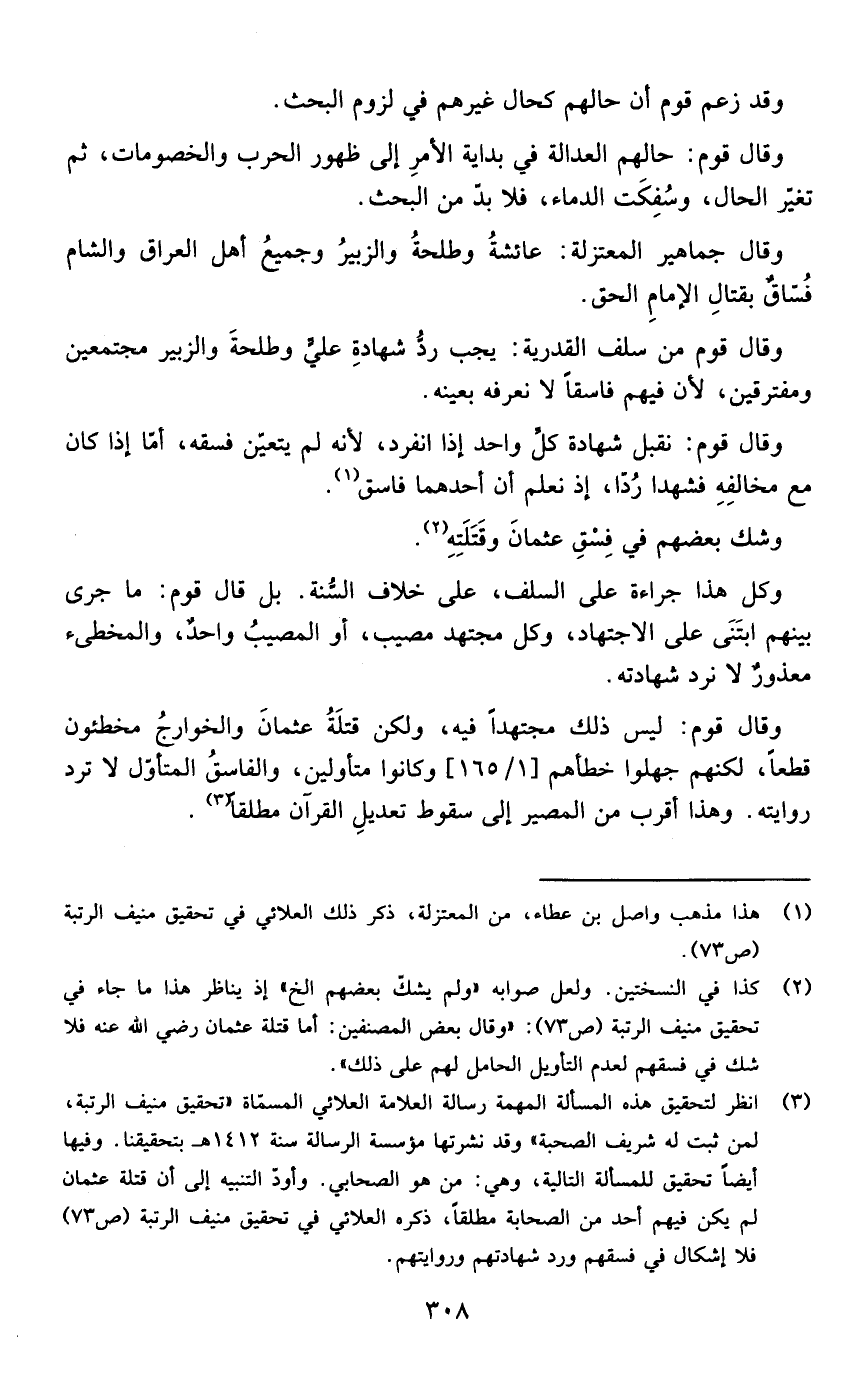 وقال قوم من سلف القدرية :يجب رد شهادة علي وطلحة والزبير مجتمعين ومفترقين لأن فيهم فاسقا لا نعرفه بعينه.