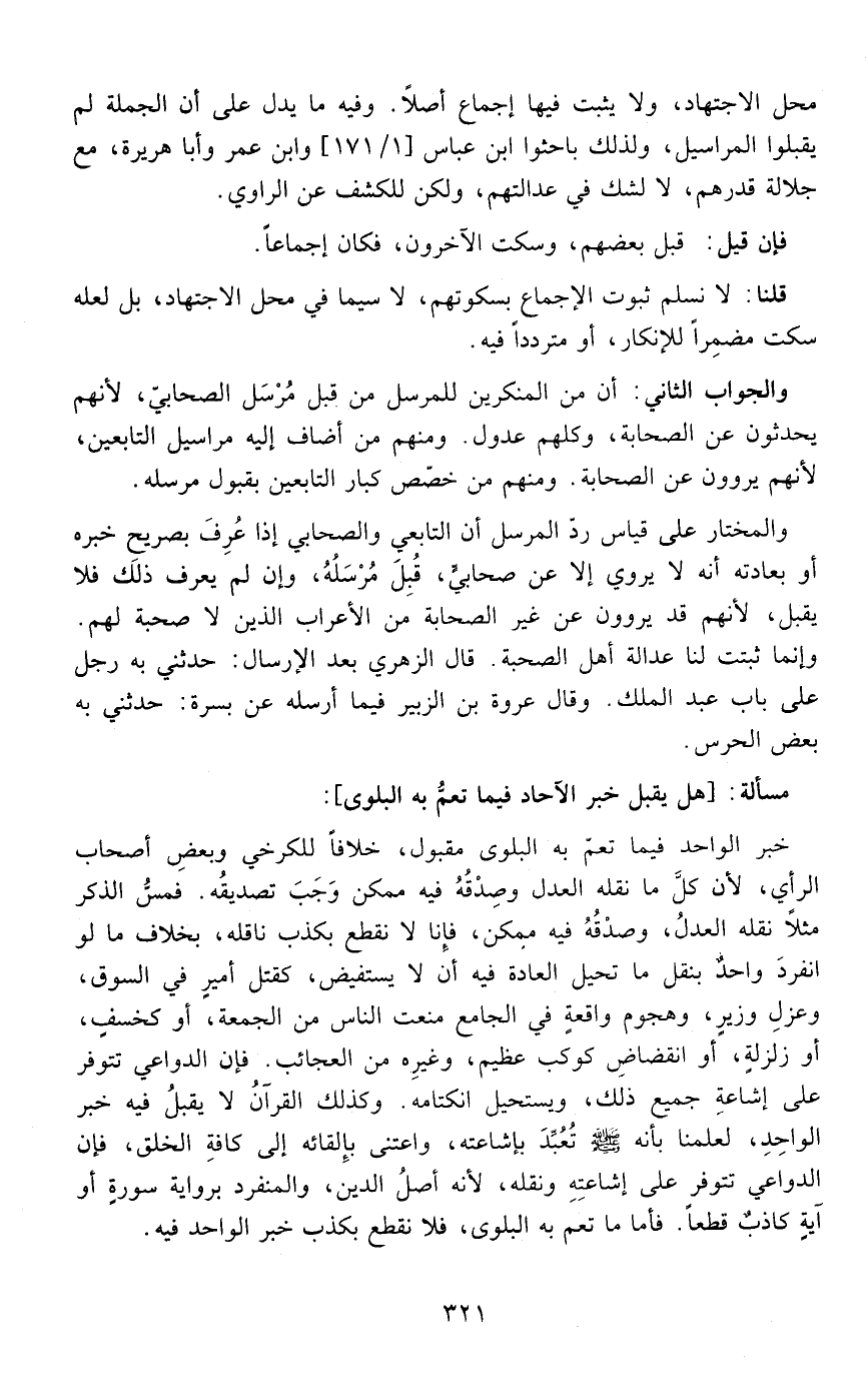 محل الاجتهاد ولا يثبت فيها إجماع أصلا وفيه ما يدل على أن الجملة لم يقبلوا المراسيل ولذلك باحثوا ابن عباس وابن عمر وأبا هريرة مع جلالة قدرهم لا لشك في عدالتهم ولكن للكشف عن الراوي .
