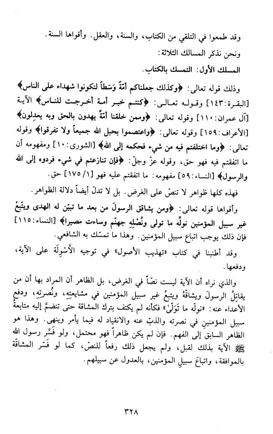 وأقواها قوله تعالى : { وَمَنْ يُشَاقِقِ الرَّسُولَ مِنْ بَعْدِ مَا تَبَيَّنَ لَهُ الْهُدَى وَيَتَّبِعْ غَيْرَ سَبِيلِ الْمُؤْمِنِينَ نُوَلِّهِ مَا تَوَلَّى وَنُصْلِهِ جَهَنَّمَ وَسَاءَتْ مَصِيرا} [النساء 115]فإن ذلك يوجب اتباع سبيل المؤمنين وهذا ما تمسك به الشافعي .