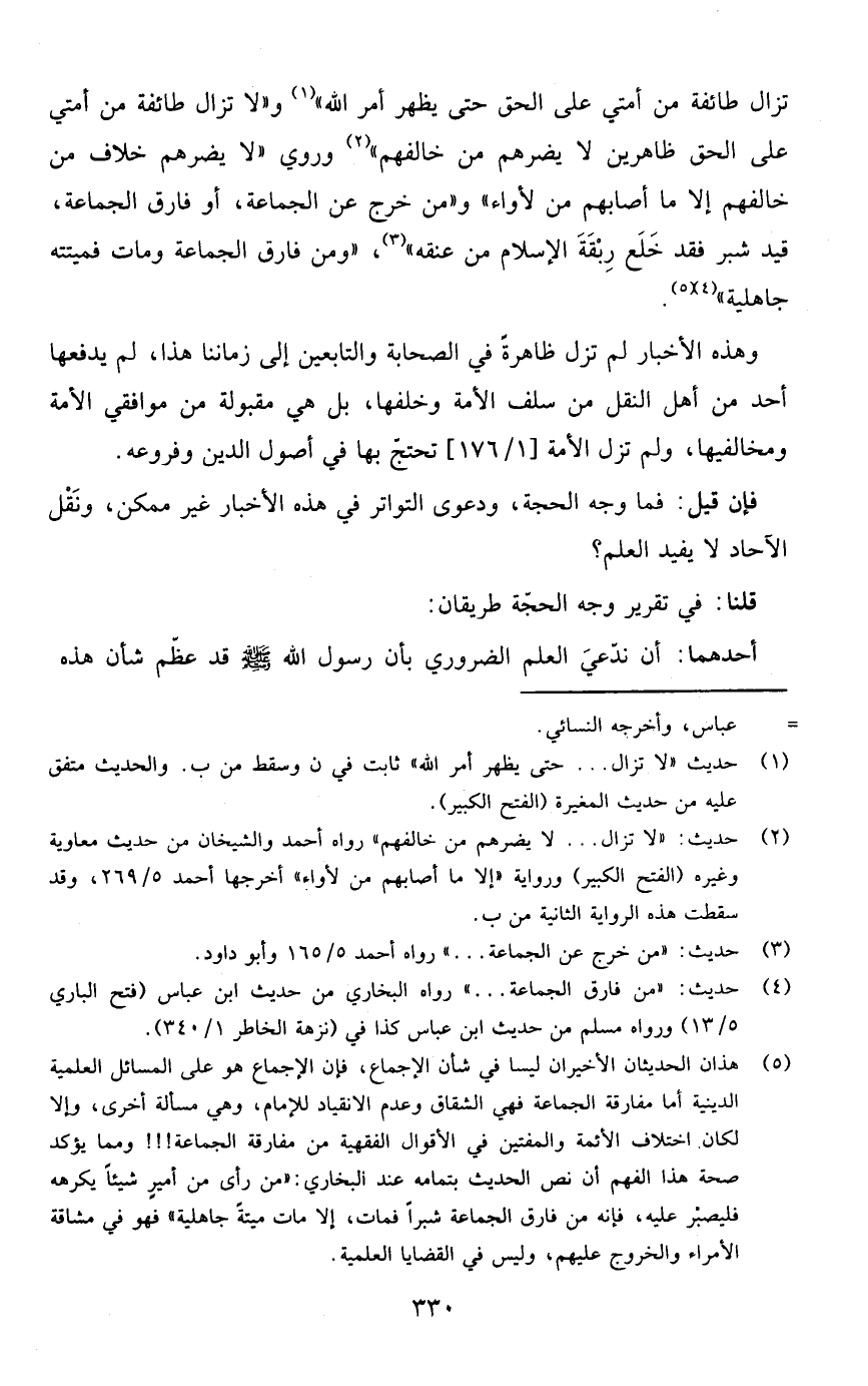 تزال طائفة من أمتي على الحق حتى يظهر أمر الله" و"لا تزال طائفة من أمتي على الحق ظاهرين لا يضرهم من خالفهم" وروي "لا يضرهم خلاف من خالفهم إلا ما أصابهم من لأواء " ومن خرج عن الجماعة أو فارق الجماعة قيد شبر فقد خلع ربقة الإسلام من عنقه" ،"ومن فارق الجماعة ومات فميتته جاهلية"