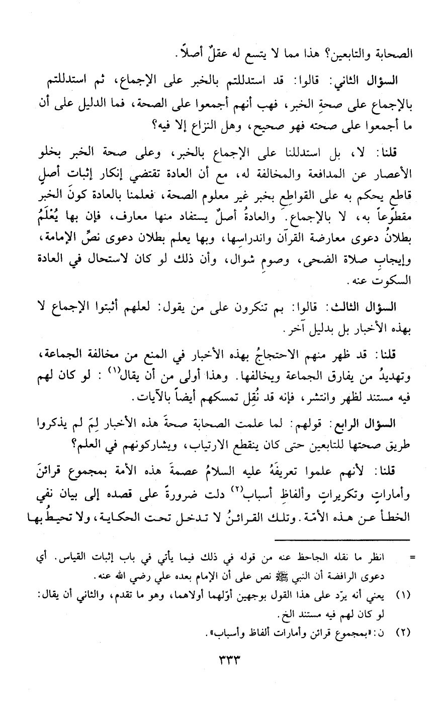 قلنا : لا بل استدللنا على الإجماع بالخبر وعلى صحة الخبر بخلو الإعصار عن المدافعة والمخالفة له مع أن العادة تقتضي إنكار إثبات أصل قاطع يحكم به على القواطع بخبر غير معلوم الصحة فعلمنا بالعادة كون الخبر مقطوعا به لا بالإجماع والعادة أصل يستفاد منها معارف فإن بها يعلم بطلان دعوى معارضة القرآن واندراسها وبها يعلم بطلان دعوى نص الإمامة وإيجاب صلاة الضحى وصوم شوال وإن ذلك لو كان لاستحال في العادة الكسوت عنه