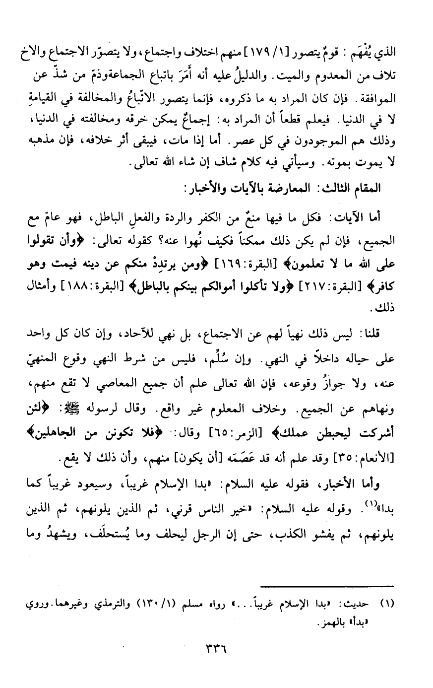 وأما الأخبار فقوله عليه السلام :" بدأ الإسلام غريبا، وسيعود غريبا كما بدأ ". وقوله عليه السلام:" خير القرون قرني ثم الذين يلونهم ثم الذين يلونهم ثم يفشو الكذب حتى إن الرجل ليحلف وما يستحلف ويشهد وما