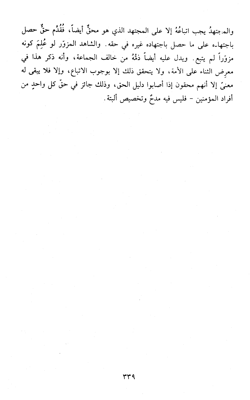 والمجتهد يجب اتباعه إلا على المجتهد الذي هو محق أيضا فقدم حق حصل باجتهاده على ما حصل باجتهاد غيره في حقه والشاهد المزور لو علم كونه مزورا لم يتبع ويدل عليه أيضا ذمة من خالف الجماعة وأنه ذكر هذا في معرض الثناء على الأمة ولا يتحقق ذلك إلا بوجوب الاتباع وإلا فلا يبقى له معنى إلا أنهم محقون إذا أصابوا دليل الحق وذلك جائز في حق كل واحد من أفراد المؤمنين فليس فيه مدح وتخصيص البتة