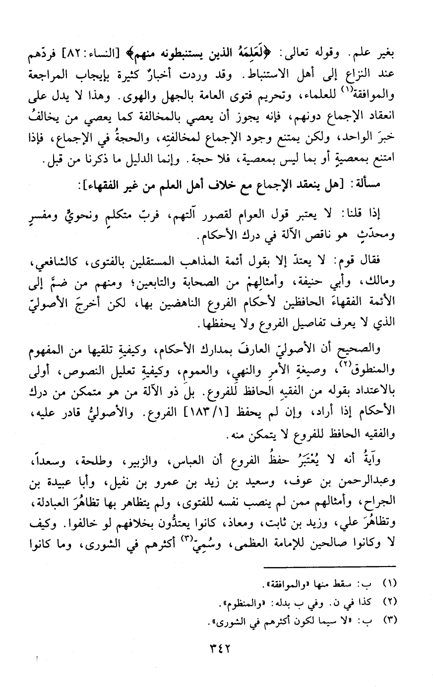 بغير علم وقوله تعالى {لَعَلِمَهُ الَّذِينَ يَسْتَنْبِطُونَهُ مِنْهُمْ } ]النساء: من الآية83[ فردهم عن النزاع إلى أهل الاستنباط وقد وردت أخبار كثيرة بإيجاب المراجعة للعلماء وتحريم فتوى العامة بالجهل والهوى وهذا لا يدل على انعقاد الإجماع دونهم فإنه يجوز أن يعصي بالمخالفة كما يعصي من يخالف خبر الواحد ولكن يمتنع وجود الإجماع لمخالفته والحجة في الإجماع فإذا امتنع بمعصية أو بما ليس بمعصية فلا حجة وإنما الدليل ما ذكرنا من قبل.