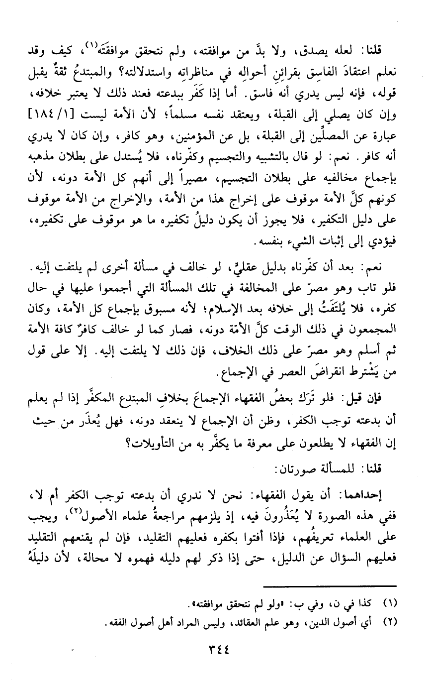قلنا: لعله يصدق ولا بد من موافقته ولو لم نتحقق موافقته كيف وقد نعلم اعتقاد الفاسق بقرائن أحواله في مناظراته واستدلالاته والمبتدع ثقة يقبل قوله فإنه ليس يدري أنه فاسق أما إذا كفر ببدعته فعند ذلك لا يعتبر خلافه وإن كان يصلي إلى القبلة ويعتقد نفسه مسلما لأن الأمة ليست عبارة عن المصلين إلى القبلة بل عن المؤمنين وهو كافر وإن كان لا يدري أنه كافر نعم لو قال بالتشبيه والتجسيم وكفرناه فلا يستدل على بطلان مذهبه بإجماع مخالفيه على بطلان التجسيم مصيرا إلى أنهم كل الأمة دونه لأن كونهم كل الأمة موقوف على إخراج هذا من الأمة والإخراج من الأمة موقوف على دليل التكفير فلا يجوز أن يكون دليل تكفيره ما هو موقوف على تكفيره فيؤدي إلى إثبات الشيء بنفسه