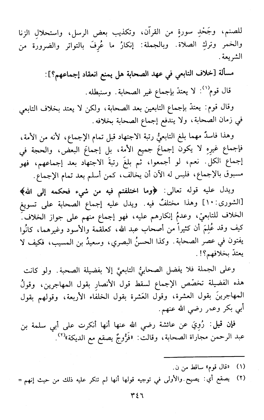 وعلى الجملة فلا يفضل الصحابي التابعي إلا بفضيلة الصحبة ولو كانت هذه الفضيلة تخصص الإجماع لسقط قول الأنصار بقول المهاجرين وقول المهاجرين بقول العشرة وقول العشرة بقول الخلفاء الأربعة وقولهم بقول أبي بكر وعمر رضي الله عنهم.