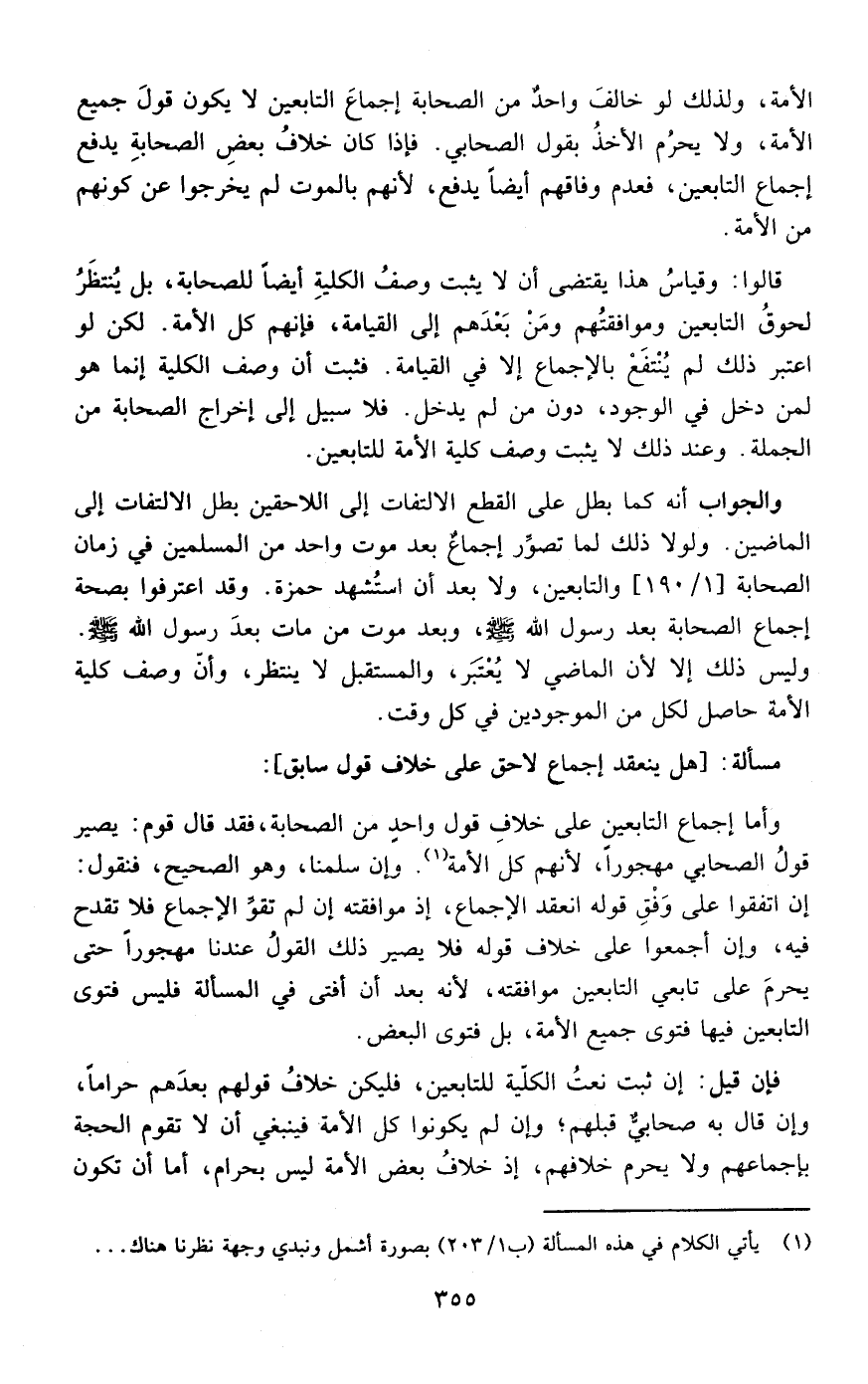 قالوا :وقياس هذا يقتضي أن لا يثبت وصف الكلية أيضا للصحابة بل ينتظر لحوق التابعين وموافقتهم من بعدهم إلى القيامة فإنهم كل الأمة لكن لو اعتبر ذلك لم ينتفع بالإجماع إلا في القيامة فثبت أن وصف الكلية إنما هو لمن دخل في الوجود دون من لم يدخل فلا سبيل إلى إخراج الصحابة من الجملة وعند ذلك لا يثبت وصف كلية الأمة للتابعين
