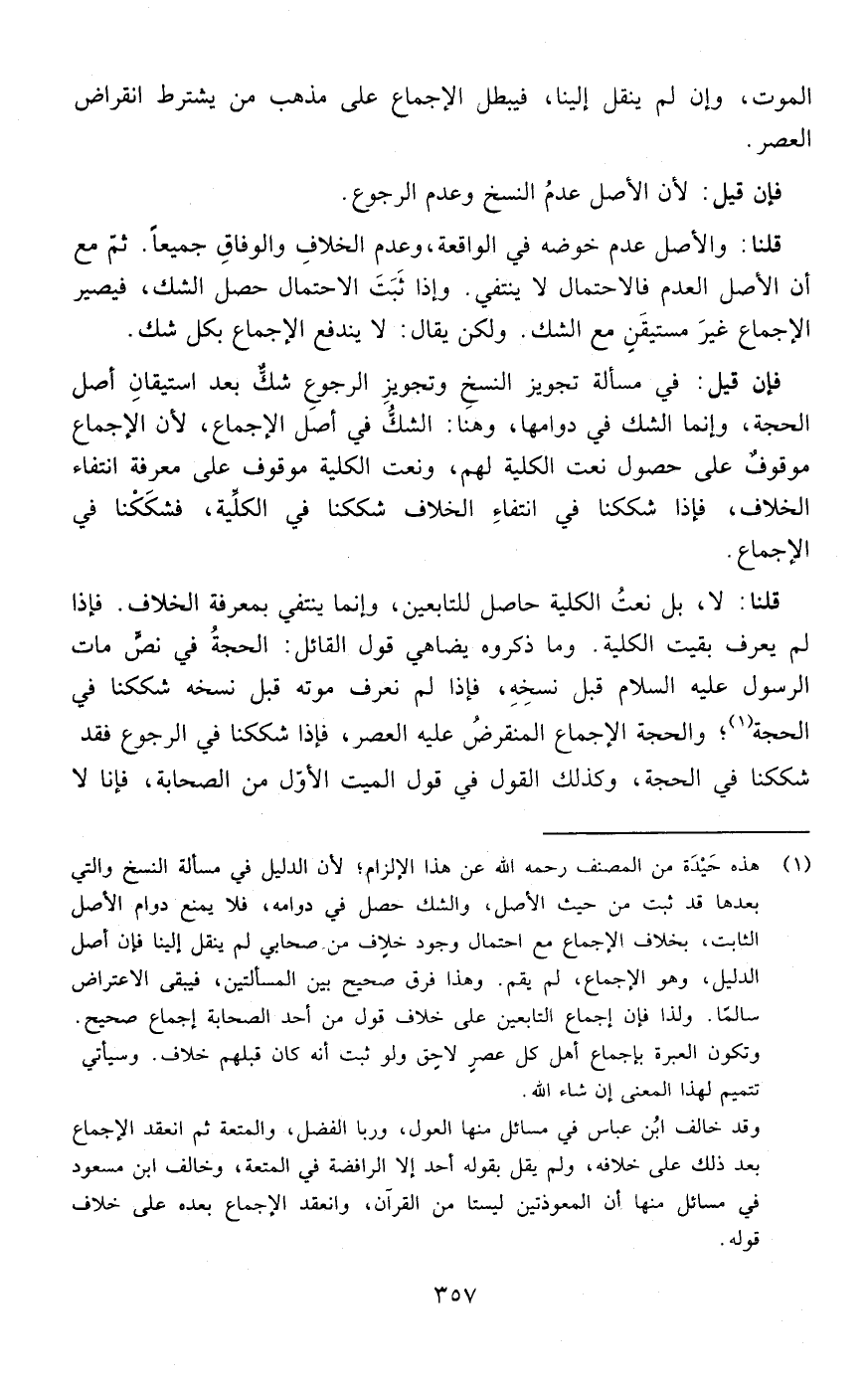 فإن قيل: في مسألة تجويز النسخ وتجويز الرجوع شك بعد استيقان أصل الحجة وإنما الشك في دوامها وهاهنا الشك في أصل الإجماع لأن الإجماع موقوف على حصول نعت الكلية لهم ونعت الكلية موقوف على معرفة انتفاء الخلاف فإذا شككنا في انتفاء الخلاف شككنا في الكلية فشككنا في الإجماع.