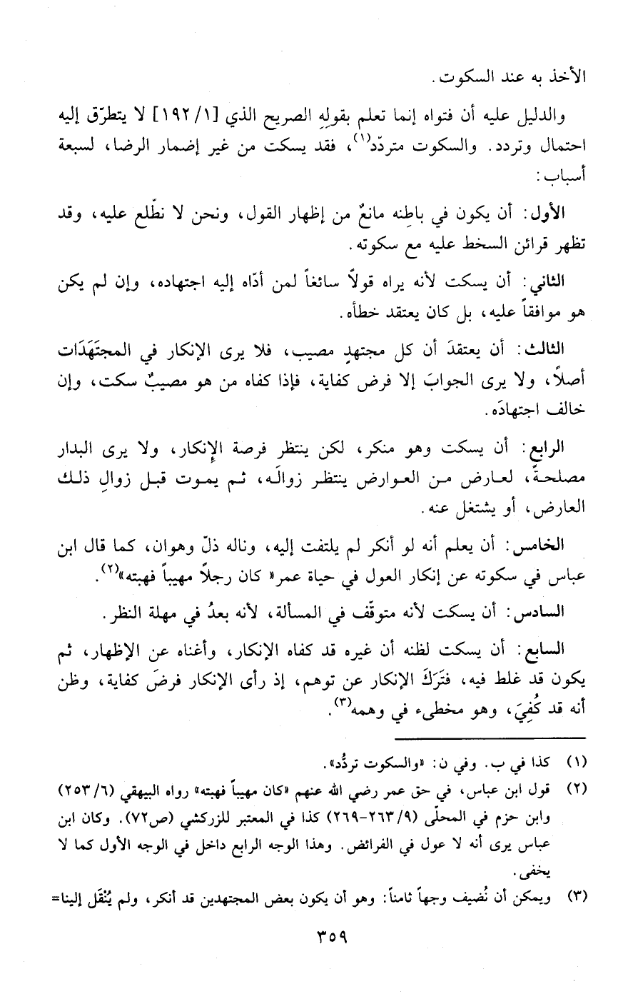 والدليل عليه أن فتواه إنما تعلم بقوله الصريح الذي لا يتطرق إليه احتمال وتردد والسكوت متردد فقد يسكت من غير إضمار الرضا لسبعة أسباب :