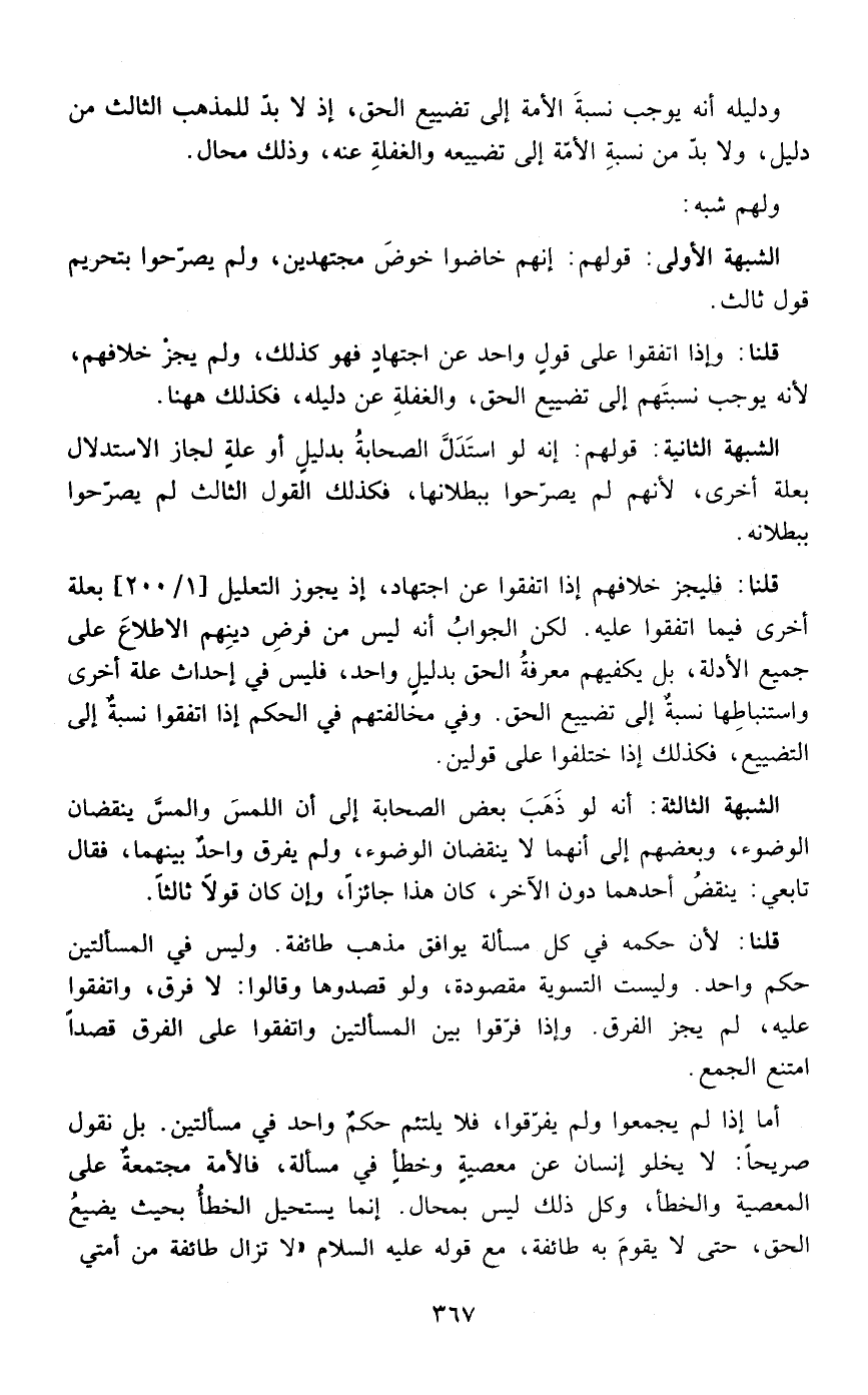 ودليله أنه يوجب نسبة الأمة إلى تضييع الحق إذ لا بد لمذهب الثالث من دليل ولا بد من نسبة الأمة إلى تضييعه والغفلة عنه وذلك محال