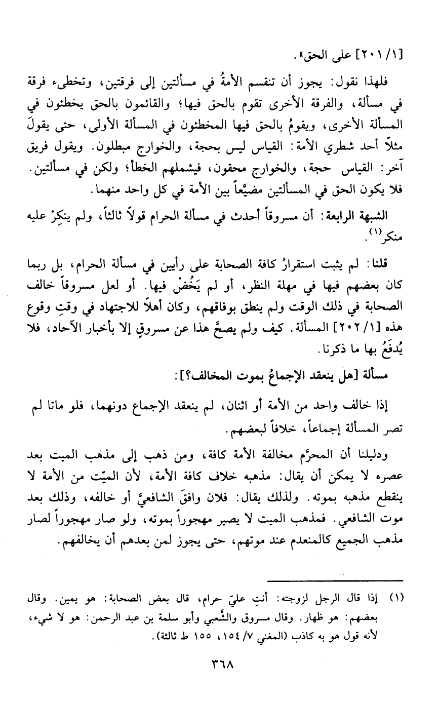 فلهذا نقول: يجوز أن تنقسم الأمة في مسألتين إلى فرقتين وتخطىء فرقة في مسألة والفرقة الأخرى تقوم بالحق فيها والقائمون بالحق يخطئون في المسألة الأخرى ويقوم بالحق فيها المخطئون في المسألة الأولى حتى يقول مثلا أحد شطري الأمة القياس ليس بحجة والخوارج مبطلون ويقول فريق آخر القياس حجة والخوارج محقون فيشملهم الخطأ ولكن في مسألتين فلا يكون الحق في مسألتين مضيعا بين الأمة في كل واحد منهما