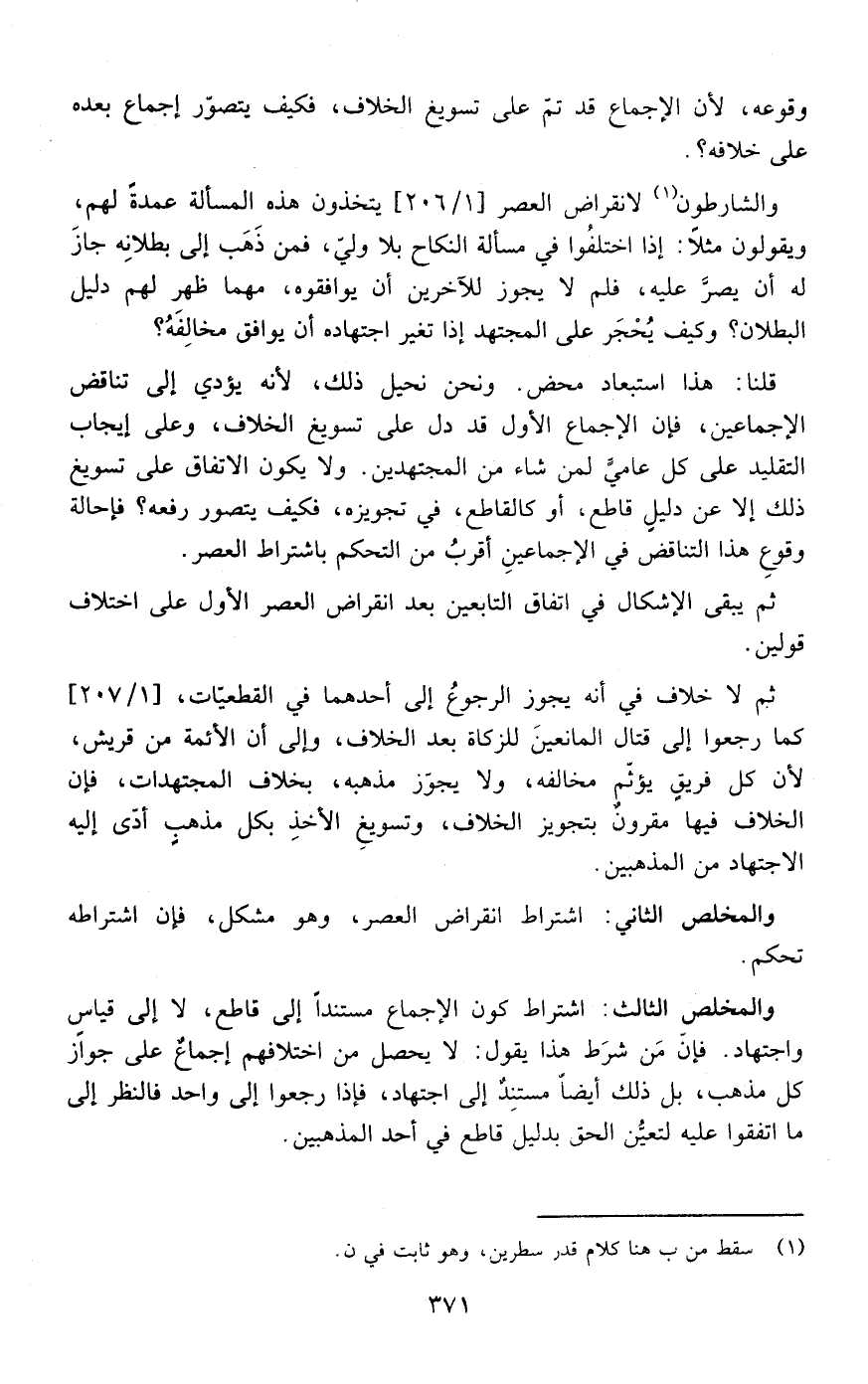 قلنا:هذا استبعاد محض ونحن نحيل ذلك لأنه يؤدي إلى تناقض الإجماعين فإن الإجماع الأول قد دل على تسويغ الخلاف وعلى إيجاب التقليد على كل عامي لمن شاء من المجتهدين ولا يكون الاتفاق على تسويغ ذلك إلا عن دليل قاطع أو كالقاطع في تجويزه وكيف يتصور رفعه ؟فإحالة وقوع هذا التناقض في الإجماعين أقرب من التحكم باشتراط العصر