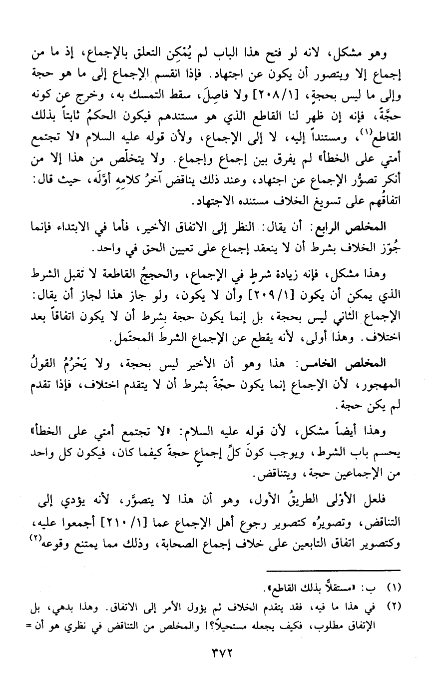 وهذا مشكل فإنه زيادة شرط في الإجماع والحجج القاطعة لا تقبل الشرط الذي يمكن أن يكون وأن لا يكون ولو جاز هذا لجاز أن يقال الإجماع الثاني ليس بحجة بل إنما يكون حجة بشرط أن لا يكون اتفاقا بعد اختلاف وهذا أولى لأنه يقطع عن الإجماع الشرط المحتمل.