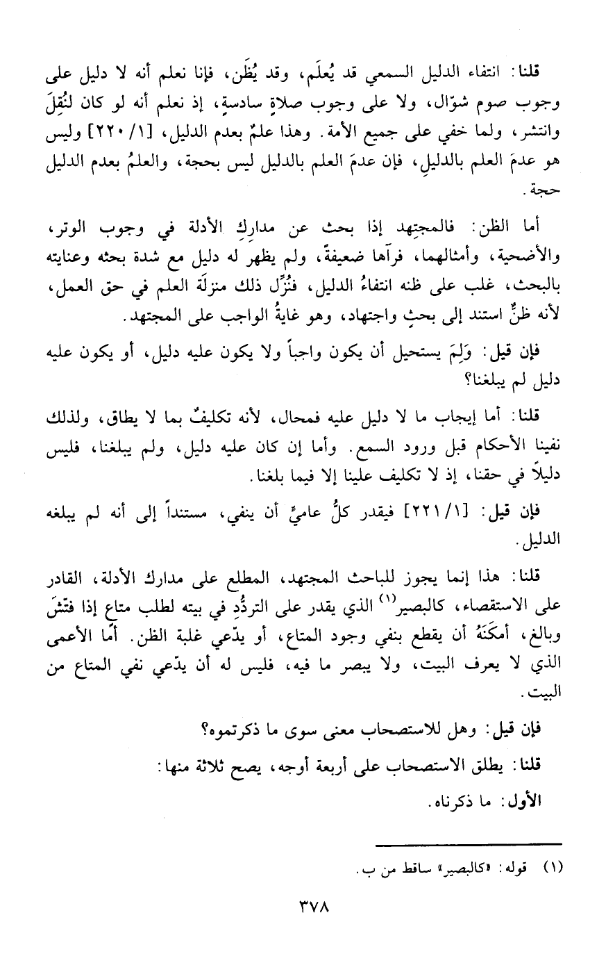 قلنا هذا إنما يجوز للباحث المجتهد المطلع على مدارك الأدلة القادر على الاستقصاء كالذي يقدر على التردد في بيته لطلب متاع إذا فتش وبالغ أمكنه أن يقطع بنفي المتاع أو يدعي غلبة الظن أما الأعمى الذي لا يعرف البيت ولا يبصر ما فيه فليس له أن يدعي نفي المتاع من البيت