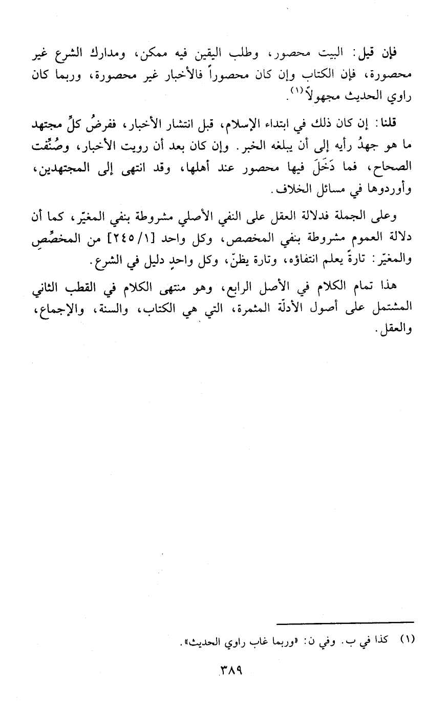 هذا تمام الكلام في الأصل الرابع وهو منتهى الكلام في القطب الثاني المشتمل على أصول الأدلة المثمرة التي هي الكتاب والسنة والإجماع والعقل