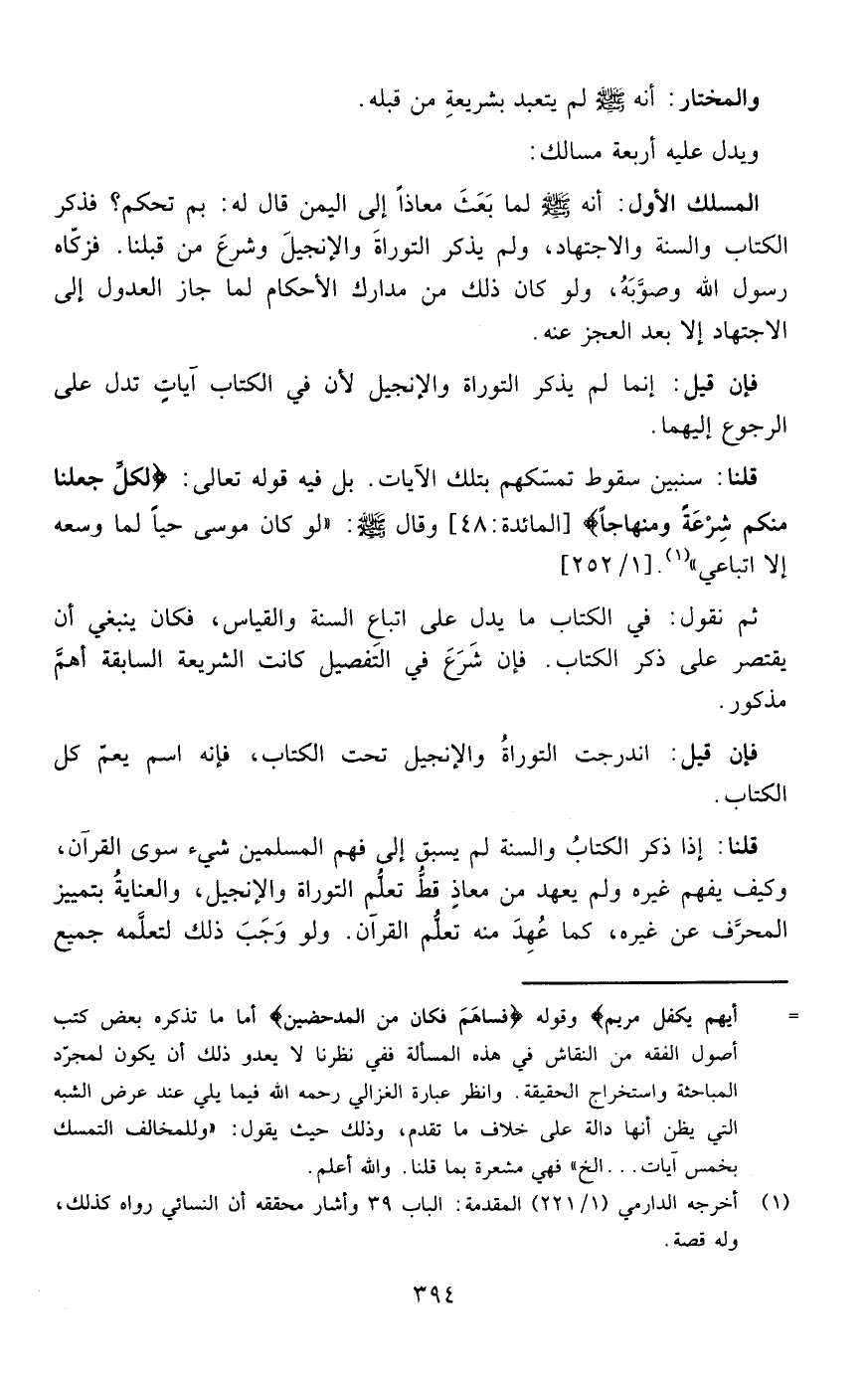 قلنا: سنبين سقوط تمسكهم بتلك الآيات بل فيه قوله تعالى {لِكُلٍّ جَعَلْنَا مِنْكُمْ شِرْعَةً وَمِنْهَاجاً } ]المائدة: من الآية48[وقال صلى الله عليه وسلم :" لو كان موسى حيا لما وسعه إلا اتباعي "