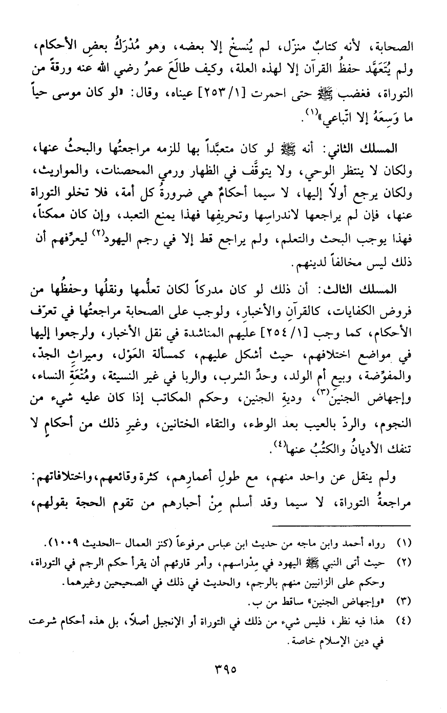 المسلك الثالث: أن ذلك لو كان مدركا لكان تعلمها ونقلها وحفظها من فروض الكفايات كالقرآن والأخبار ولوجب على الصحابة مراجعتها في تعرف الأحكام كما وجب عليهم المناشدة في نقل الأخبار ولرجعوا إليها في مواضع اختلافهم حيث أشكل عليهم كمسألة العول وميراث الجد والمفوضة وبيع أم الولد وحد الشرب والربا في غير النسيئة ومتعة النساء ودية الجنين وحكم المكاتب إذا كان عليه شيء من النجوم والرد بالعيب بعد الوطء والتقاء الختانين وغير ذلك من أحكام لا تنفك الأديان والكتب عنها