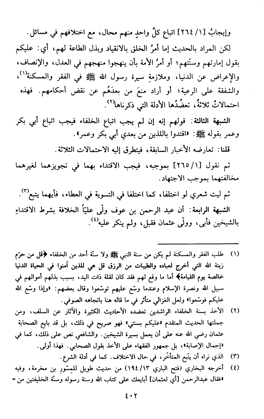 وإيجاب اتباع كل واحد منهم محال مع اختلافهم في مسائل لكن المراد بالحديث إما أمر الخلق بالانقياد وبذل الطاعة لهم أي عليكم بقبول إمارتهم وسنتهم أو أمر الأمة بأن ينهجوا منهجهم في العدل والإنصاف والإعراض عن الدنيا وملازمة سيرة رسول الله صلى الله عليه وسلم في الفقر والمسكنة والشفقة على الرعية أو أراد منع من بعدهم عن نقض أحكامهم فهذه احتمالات ثلاثة تعضدها الأدلة التي ذكرناها