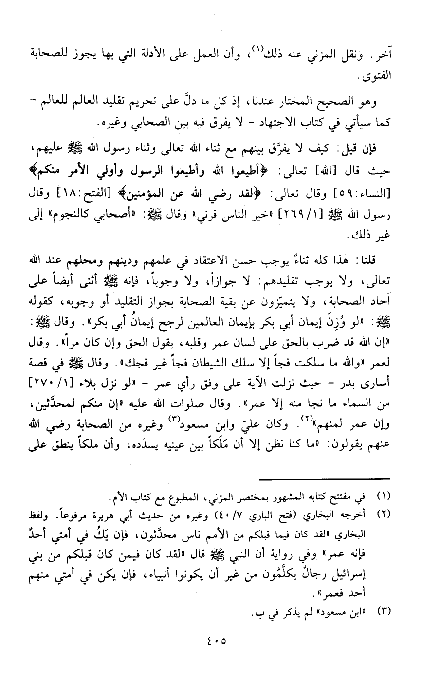 قلنا: هذا كله ثناء يوجب حسن الاعتقاد في علمهم ودينهم ومحلهم عند الله تعالى ولا يوجب تقليدهم لا جوازا ولا وجوبا فإنه صلى الله عليه وسلم أثنى أيضا على آحاد الصحابة ولا يتميزون عن بقية الصحابة بجواز التقليد أو وجوبه كقوله صلى الله عليه وسلم: "لو وزن إيمان أبي بكر بإيمان العالمين لرجح إيمان أبي بكر " وقال صلى الله عليه وسلم :"إن الله قد ضرب بالحق على لسان عمر وقلبه، يقول الحق وإن كان مرا " وقال لعمر " والله ما سلكت فجا إلا سلك الشيطان فجا غير فجك" وقال في قصة أسارى بدر حيث نزلت الآية على وفق رأي عمر: "لو نزل بلاء من السماء ما نجا منه إلا عمر" وقال صلوات الله عليه " إن منكم لمحدثين وإن عمر لمنهم " وكان علي رضي الله عنه وغيره من الصحابة يقولون "ما كنا نظن إلا أن ملكا بين عينيه يسدده وأن ملكا ينطق على