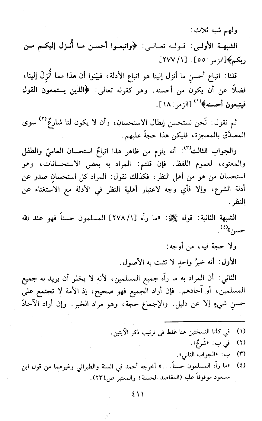 الشبهة الأولى قوله تعالى {وَاتَّبِعُوا أَحْسَنَ مَا أُنْزِلَ إِلَيْكُمْ مِنْ رَبِّكُمْ}] الزمر: من الآية55[وقال {الَّذِينَ يَسْتَمِعُونَ الْقَوْلَ فَيَتَّبِعُونَ أَحْسَنَهُ } ]الزمر: من الآية18[